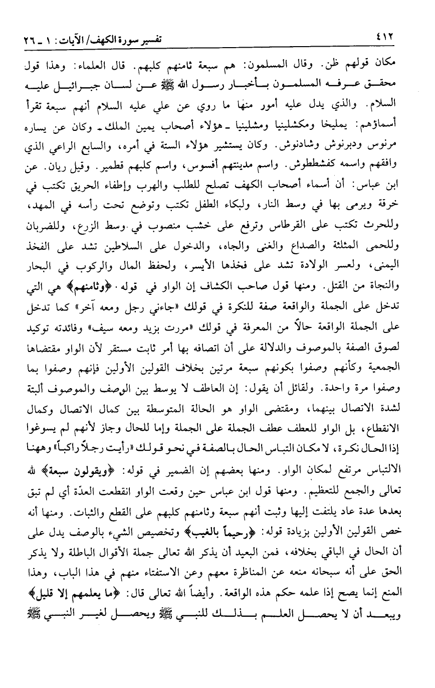 وقيل ريان. عن ابن عباس: أن أسماء أصحاب الكهف تصلح للطلب والهرب وإطفاء الحريق تكتب في خرقة ويرمى بها في وسط النار، ولبكاء الطفل تكتب وتوضع تحت رأسه في المهد، وللحرث تكتب على القرطاس وترفع على خشب منصوب في وسط الزرع، وللضربان وللحمى المثلثة والصداع والغنى والجاه، والدخول على السلاطين تشد على الفخذ اليمنى، ولعسر الولادة تشد على فخذها الأيسر، ولحفظ المال والركوب في البحار والنجاة من القتل. ومنها قول صاحب الكشاف إن الواو في قوله وَثامِنُهُمْ هي التي تدخل على الجملة والواقعة صفة للنكرة في قولك «جاءني رجل ومعه آخر» كما تدخل على الجملة الواقعة حالا من المعرفة في قولك «مررت بزيد ومعه سيف» وفائدته توكيد لصوق الصفة بالموصوف والدلالة على أن اتصافه بها أمر ثابت مستقر لأن الواو مقتضاها الجمعية وكأنهم وصفوا بكونهم سبعة مرتين بخلاف القولين الأولين فإنهم وصفوا بما وصفوا مرة واحدة. ولقائل أن يقول: إن العاطف لا يوسط بين الوصف والموصوف البتة لشدة الاتصال بينهما، ومقتضى الواو هو الحالة المتوسطة بين كمال الاتصال وكمال الانقطاع، بل الواو للعطف عطف الجملة على الجملة وإما للحال وجاز لأنهم لم يسوغوا إذا الحال نكرة، لا مكان التباس الحال بالصفة في نحو قولك «رأيت رجلا راكبا» وهاهنا الالتباس مرتفع لمكان الواو. ومنها بعضهم إن الضمير في قوله: وَيَقُولُونَ سَبْعَةٌ لله تعالى والجمع للتعظيم. ومنها قول ابن عباس حين وقعت الواو انقطعت العدّة أي لم تبق بعدها عدة عاد يلتفت إليها وثبت أنهم سبعة وثامنهم كلبهم على القطع والثبات. ومنها أنه خص القولين الأولين بزيادة قوله: رَجْماً بِالْغَيْبِ وتخصيص الشيء بالوصف يدل على أن الحال في الباقي بخلافه، فمن البعيد أن يذكر الله تعالى جملة الأقوال الباطلة ولا يذكر الحق على أنه سبحانه منعه عن المناظرة معهم وعن الاستفتاء منهم في هذا الباب، وهذا المنع إنما يصح إذا علمه حكم هذه الواقعة. وأيضا الله تعالى قال: ما يَعْلَمُهُمْ إِلَّا قَلِيلٌ ويبعد أن لا يحصل العلم بذلك للنبي صلى الله عليه وسلم ويحصل لغير النبي صلى الله عليه وسلم