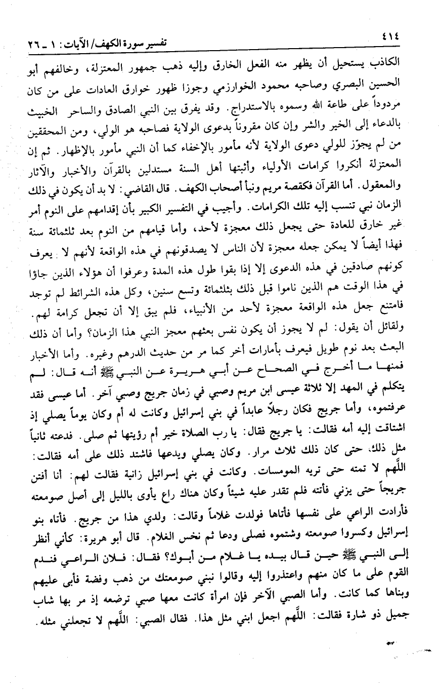 أخرج في الصحاح عن أبي هريرة عن النبي صلى الله عليه وسلم أنه قال: لم يتكلم في المهد إلا ثلاثة عيسى ابن مريم وصبي في زمان جريج وصبي آخر. أما عيسى فقد عرفتموه، وأما جريج فكان رجلا عابدا في بني إسرائيل وكانت له أم وكان يوما يصلي إذ اشتاقت إليه أمه فقالت: يا جريج فقال: يا رب الصلاة خير أم رؤيتها ثم صلى. فدعته ثانيا مثل ذلك حتى كان ذلك ثلاث مرار. وكان يصلي ويدعها فاشتد ذلك على أمه فقالت: