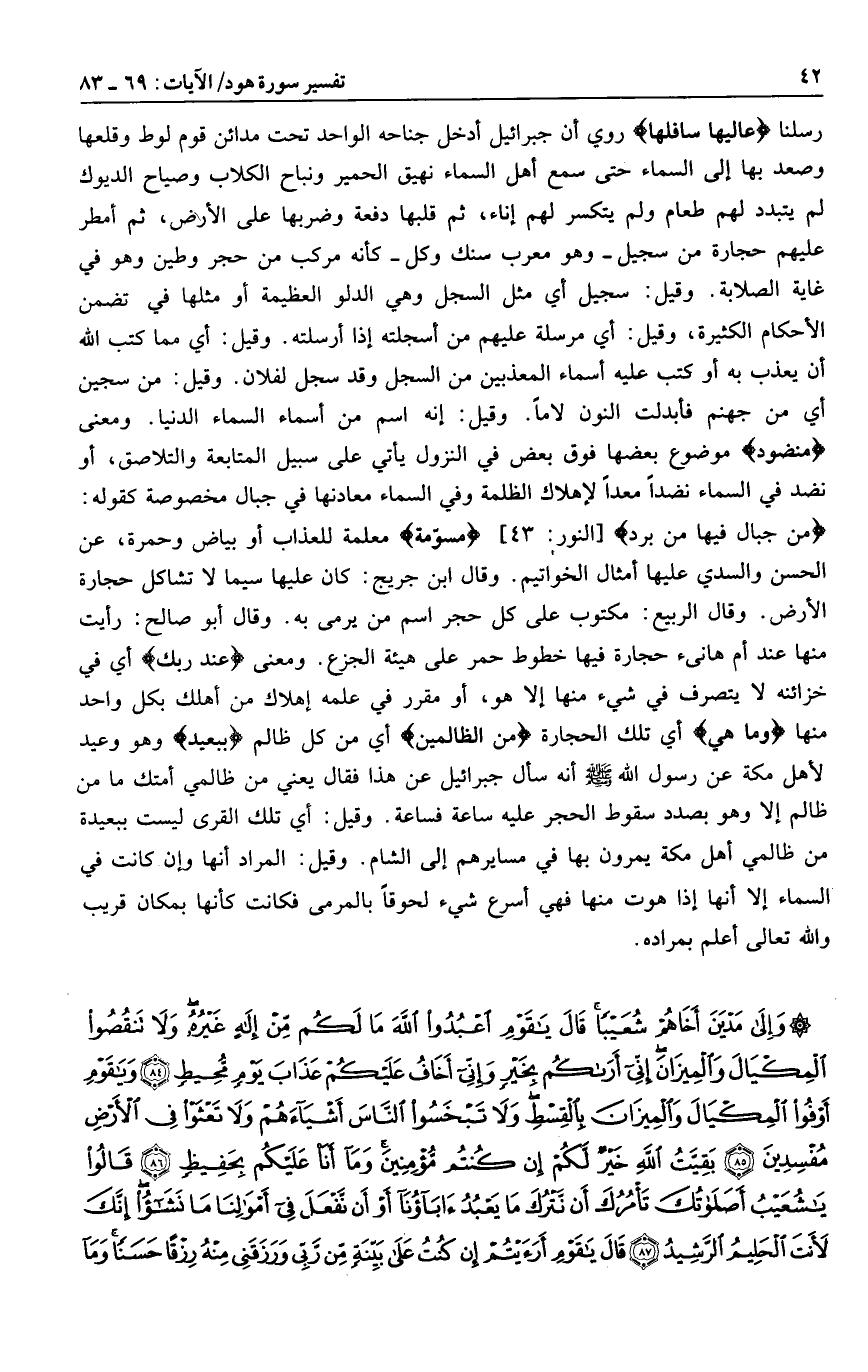 روي أن جبرائيل أدخل جناحه الواحد تحت مدائن قوم لوط وقلعها وصعد بها إلى السماء حتى سمع أهل السماء نهيق الحمير ونباح الكلاب وصياح الديوك لم يتبدد لهم طعام ولم يتكسر لهم إناء، ثم قلبها دفعة وضربها على الأرض، ثم أمطر عليهم حجارة من سجيل- وهو معرب سنك وكل- كأنه مركب من حجر وطين وهو في غاية الصلابة.