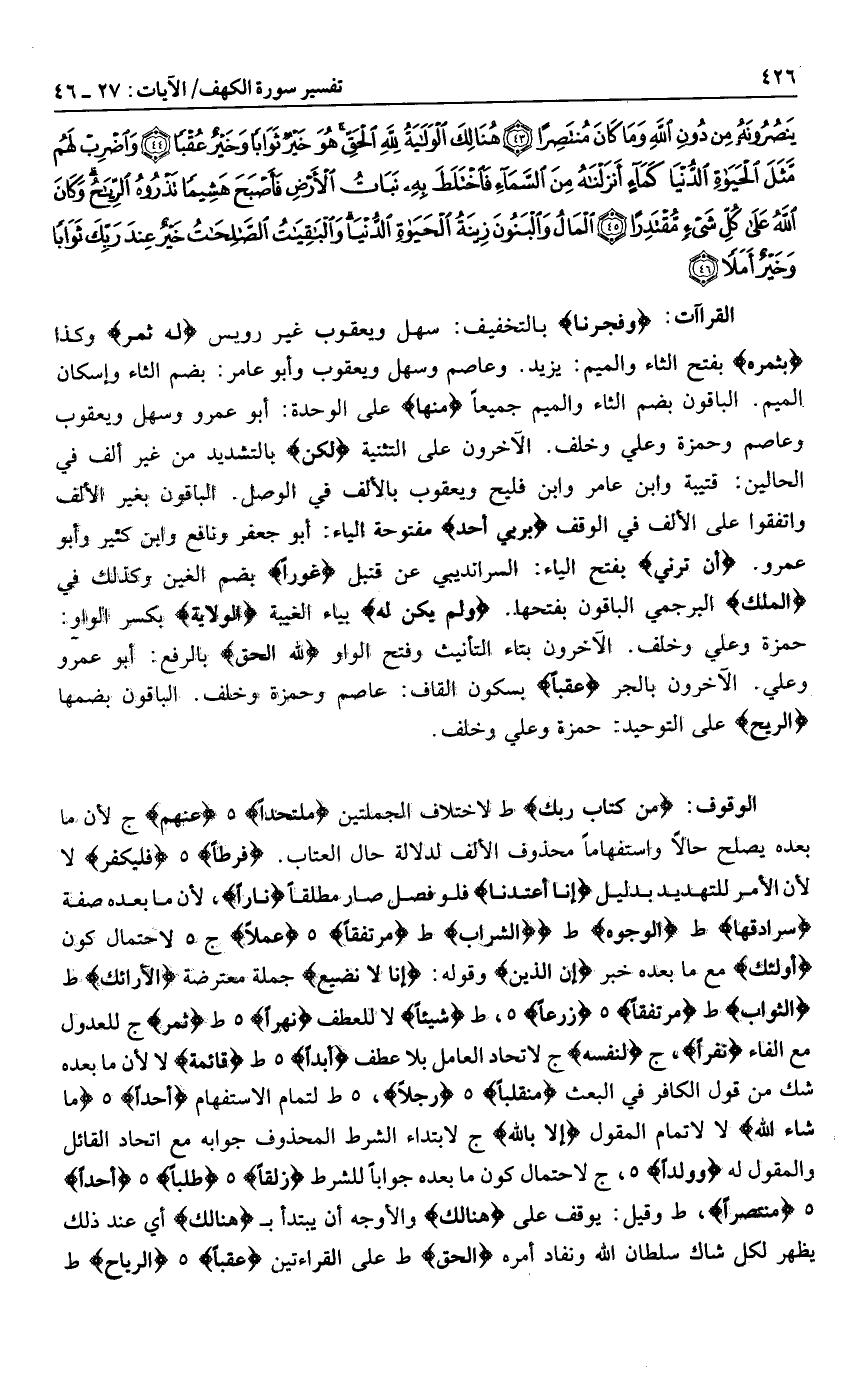 وَفَجَّرْنا بالتخفيف: سهل ويعقوب غير رويس لَهُ ثَمَرٌ وكذا بِثَمَرِهِ بفتح الثاء والميم: يزيد. وعاصم وسهل ويعقوب وأبو عامر: بضم الثاء وإسكان الميم. والباقون بضم الثاء والميم جميعا مِنْها على الوحدة: أبو عمرو وسهل ويعقوب وعاصم وحمزة وعلي وخلف. الآخرون على التثنية لكن بالتشديد من غير ألف في الحالين: قتيبة وابن عامر وابن فليح ويعقوب بالألف في الوصل. الباقون بغير الألف واتفقوا على الألف في الوقف بِرَبِّي أَحَداً مفتوحة الياء: أبو جعفر ونافع وابن كثير وأبو عمرو. أن ترني بفتح الياء: السرانديبي عن قنبل غورا بضم الغين وكذلك في الْمُلْكُ البرجمي الباقون بفتحها. ولم يكن له بياء الغيبة الولاية بكسر الواو: