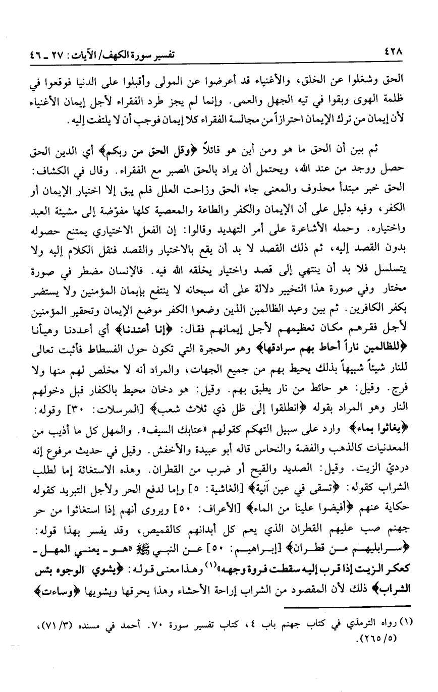 الحق خبر مبتدأ محذوف والمعنى جاء الحق وزاحت العلل فلم يبق إلا اختيار الإيمان أو الكفر، وفيه دليل على أن الإيمان والكفر والطاعة والمعصية كلها مفوّضة إلى مشيئة العبد واختياره. وحمله الأشاعرة على أمر التهديد وقالوا: إن الفعل الاختياري يمتنع حصوله بدون القصد إليه، ثم ذلك القصد لا بد أن يقع بالاختيار والقصد فنقل الكلام إليه ولا يتسلسل فلا بد أن ينتهي إلى قصد واختيار يخلقه الله فيه. فالإنسان مضطر في صورة مختار وفي صورة هذا التخيير دلالة على أنه سبحانه لا ينتفع بإيمان المؤمنين ولا يستضر بكفر الكافرين. ثم بين وعيد الظالمين الذين وضعوا الكفر موضع الإيمان وتحقير المؤمنين لأجل فقرهم مكان تعظيمهم لأجل إيمانهم فقال: إِنَّا أَعْتَدْنا أي أعددنا وهيأنا لِلظَّالِمِينَ ناراً أَحاطَ بِهِمْ سُرادِقُها وهو الحجرة التي تكون حول الفسطاط فأثبت تعالى للنار شيئا شبيها بذلك يحيط بهم من جميع الجهات، والمراد أنه لا مخلص لهم منها ولا فرج. وقيل: هو حائط من نار يطبق بهم. وقيل: هو دخان محيط بالكفار قبل دخولهم النار وهو المراد بقوله انْطَلِقُوا إِلى ظِلٍّ ذِي ثَلاثِ شُعَبٍ [المرسلات: 30] وقوله: