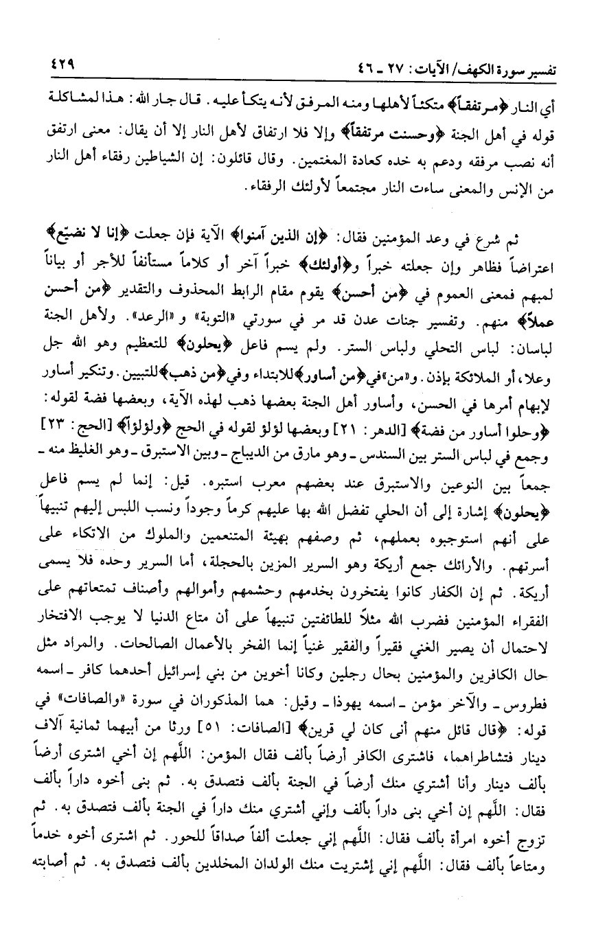وَحُلُّوا أَساوِرَ مِنْ فِضَّةٍ [الدهر: 21] وبعضها لؤلؤ لقوله في الحج وَلُؤْلُؤاً [الحج: 23] وجمع في لباس الستر بين السندس- وهو مارق من الديباج- وبين الإستبرق- وهو الغليظ منه- جمعا بين النوعين والإستبرق عند بعضهم معرب استبره. قيل: إنما لم يسم فاعل يُحَلَّوْنَ إشارة إلى أن الحلي تفضل الله بها عليهم كرما وجودا ونسب اللبس إليهم تنبيها على أنهم استوجبوه بعملهم، ثم وصفهم بهيئة المتنعمين والملوك من الاتكاء على أسرتهم. والأرائك جمع أريكة وهو السرير المزين بالحجلة، أما السرير وحده فلا يسمى أريكة. ثم إن الكفار كانوا يفتخرون بخدمهم وحشمهم وأموالهم وأصناف تمتعاتهم على الفقراء المؤمنين فضرب الله مثلا للطائفتين تنبيها على أن متاع الدنيا لا يوجب الافتخار لاحتمال أن يصير الغني فقيرا والفقير غنيا إنما الفخر بالأعمال الصالحات. والمراد مثل حال الكافرين والمؤمنين بحال رجلين وكانا أخوين من بني إسرائيل أحدهما كافر- اسمه فطروس- والآخر مؤمن- اسمه يهوذا- وقيل: هما المذكوران في سورة «والصافات» في قوله: قالَ قائِلٌ مِنْهُمْ إِنِّي كانَ لِي قَرِينٌ [الصافات: 51] ورثا من أبيهما ثمانية آلاف دينار فتشاطراهما، فاشترى الكافر أرضا بألف فقال المؤمن: اللهم إن أخي اشترى أرضا بألف دينار وأنا أشتري منك أرضا في الجنة بألف فتصدق به. ثم بنى أخوه دارا بألف فقال: اللهم إن أخي بنى دارا بألف وإني أشتري منك دارا في الجنة بألف فتصدق به. ثم تزوج أخوه امرأة بألف فقال: اللهم إني جعلت ألفا صداقا للحور. ثم اشترى أخوه خدما ومتاعا بألف فقال: اللهم إني اشتريت منك الولدان المخلدين بألف فتصدق به. ثم أصابته