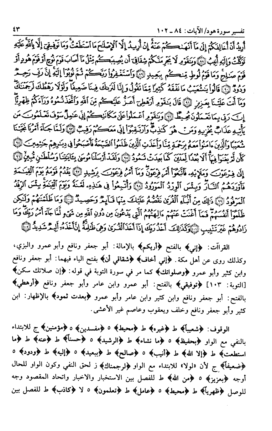 شُعَيْباً ط غَيْرُهُ ط مُحِيطٍ هـ مُفْسِدِينَ هـ مُؤْمِنِينَ ج للابتداء بالنفي مع الواو بِحَفِيظٍ هـ ما نَشؤُا ط الرَّشِيدُ هـ حَسَناً ط عَنْهُ ط مَا اسْتَطَعْتُ ط إِلَّا بِاللَّهِ ط أُنِيبُ هـ صالِحٍ ط بِبَعِيدٍ هـ إِلَيْهِ ط وَدُودٌ هـ ضَعِيفاً ج لأن «لولا» للابتداء مع الواو لَرَجَمْناكَ ز لحق النفي وكون الواو للحال أوجه بِعَزِيزٍ هـ مِنَ اللَّهِ ط للفصل بين الاستخبار والاخبار واتحاد المقصود وجه للوصل ظِهْرِيًّا ط مُحِيطٌ هـ عامِلٌ ط تَعْلَمُونَ هـ لا كاذِبٌ ط للفصل بين