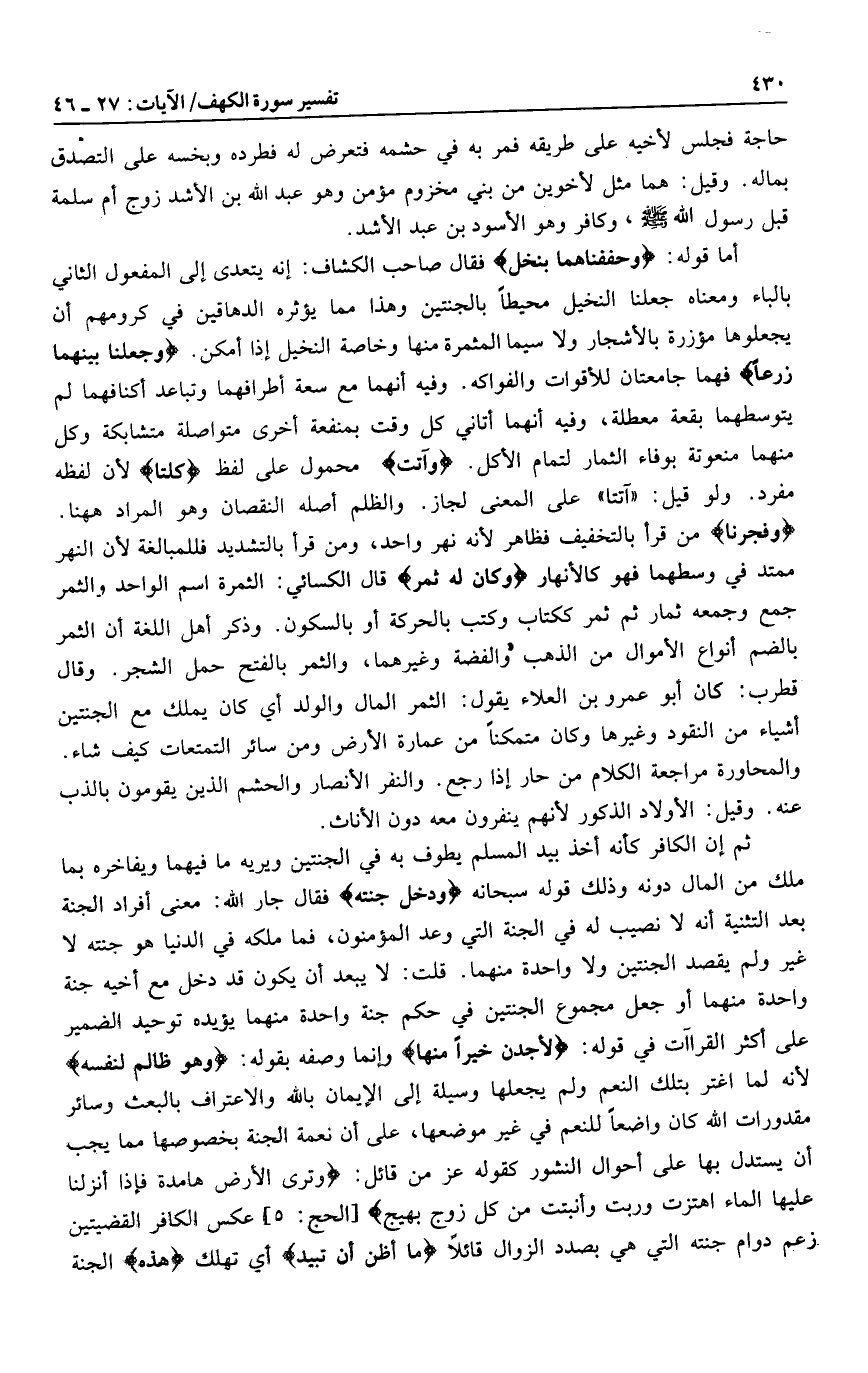 أما قوله: وَحَفَفْناهُما بِنَخْلٍ فقال صاحب الكشاف: إنه يتعدى إلى المفعول الثاني بالباء ومعناه النخيل محيطا بالجنتين وهذا مما يؤثره الدهاقين في كرومهم أن يجعلوها مؤزرة بالأشجار ولا سيما المثمرة منها وخاصة النخيل إذا أمكن. وَجَعَلْنا بَيْنَهُما زَرْعاً فهما جامعتان للأقوات والفواكه. وفيه أنهما مع سعة أطرافهما وتباعد أكنافهما لم يتوسطهما بقعة معطلة، وفيه أنهما أتاني كل وقت بمنفعة أخرى متواصلة متشابكة وكل منهما منعوتة بوفاء الثمار لتمام الأكل. وَآتَتْ محمول على لفظ كِلْتَا لأن لفظه مفرد. ولو قيل: «آتتا» على المعنى لجاز. والظلم أصله النقصان وهو المراد هاهنا.