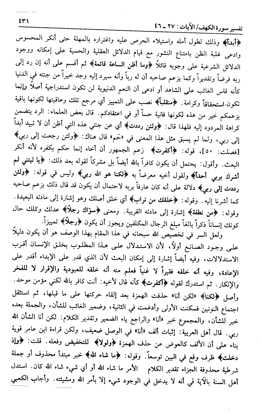 وأصل لكنا «لكن أنا» حذفت الهمزة بعد إلقاء حركتها على ما قبلها، ثم استثقل اجتماع النونين فسكنت الأولى وأدغمت في الثانية، وضمير الغائب للشأن، والجملة بعده خبر للشأن، والمجموع خبر «أنا» والراجع ياء الضمير وتقدير الكلام: لكن أنا الشأن الله ربي. قال أهل العربية: إثبات ألف «أنا» في الوصل ضعيف، ولكن قراءة ابن عامر قوية بناء على أن الألف كالعوض عن حذف الهمزة وَلَوْلا للتخفيض وفعله. قلت: وإِذْ دَخَلْتَ ظرف وقع في البين توسعا. وقوله: ما شاءَ اللَّهُ خبر مبتدأ محذوف أو جملة شرطية محذوفة الجزاء تقدير الكلام الأمر ما شاء الله أو أي شيء شاء الله كان. استدل أهل السنة بالآية في أنه لا يدخل في الوجود شيء إلا بأمر الله ومشيئته. وأجاب الكعبي