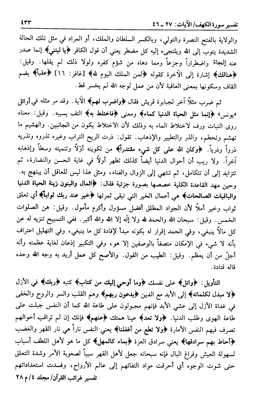 وحين مهد القاعدة الكلية خصصها بصورة جزئية فقال: الْمالُ وَالْبَنُونَ زِينَةُ الْحَياةِ الدُّنْيا وَالْباقِياتُ الصَّالِحاتُ هي أعمال الخير التي تبقى ثمرتها خَيْرٌ عِنْدَ رَبِّكَ ثَواباً أي تعلق ثواب وخير أملا لأن الجواد المطلق أفضل مسؤول وأكرم مأمول. وقيل: هن الصلوات الخمس. وقيل: سبحان الله والحمد لله ولا إله إلا الله والله أكبر. ففي التسبيح تنزيه له عن كل ما لا ينبغي، وفي الحمد إقرار له بكونه مبدأ لإفادة كل ما ينبغي، وفي التهليل اعتراف بأنه لا شيء في الإمكان متصفا بالوصفين إلا هو، وفي التكبير إذعان لغاية عظمته وأنه أجلّ من أن يعظم. وقيل: الطيب من القول. والأصح كل عمل أريد به وجه الله وحده قال قتادة.