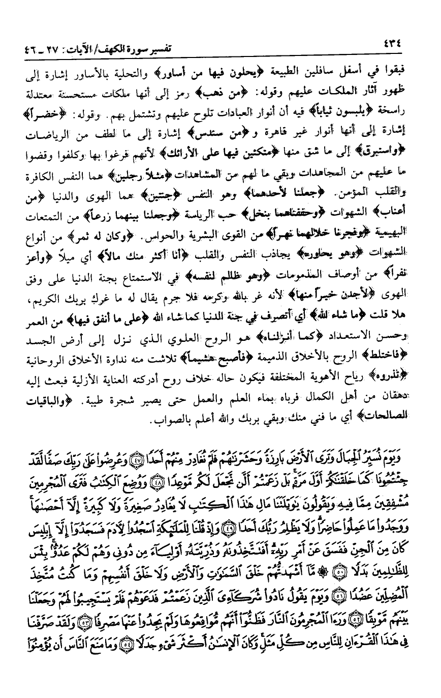 فبقوا في أسفل سافلين الطبيعة يُحَلَّوْنَ فِيها مِنْ أَساوِرَ والتحلية بالأساور إشارة إلى ظهور آثار الملكات عليهم وقوله: مِنْ ذَهَبٍ رمز إلى أنها ملكات مستحسنة معتدلة راسخة يَلْبَسُونَ ثِياباً فيه أن أنوار العبادات تلوح عليهم وتشتمل بهم. وقوله: خُضْراً إشارة إلى أنها أنوار غير قاهرة ومِنْ سُنْدُسٍ إشارة إلى ما لطف من الرياضات وَإِسْتَبْرَقٍ إلى ما شق منها مُتَّكِئِينَ فِيها عَلَى الْأَرائِكِ لأنهم فرغوا بها وكلفوا وقضوا ما عليهم من المجاهدات وبقي ما لهم من المشاهدات مَثَلًا رَجُلَيْنِ هما النفس الكافرة والقلب المؤمن. جَعَلْنا لِأَحَدِهِما وهو النفس جَنَّتَيْنِ هما الهوى والدنيا مِنْ أَعْنابٍ الشهوات وَحَفَفْناهُما بِنَخْلٍ حب الرياسة وَجَعَلْنا بَيْنَهُما زَرْعاً من التمتعات البهيمية وَفَجَّرْنا خِلالَهُما نَهَراً من القوى البشرية والحواس. وَكانَ لَهُ ثَمَرٌ من أنواع الشهوات وَهُوَ يُحاوِرُهُ يجاذب النفس والقلب أَنَا أَكْثَرُ مِنْكَ مالًا أي ميلا وَأَعَزُّ نَفَراً من أوصاف المذمومات وَهُوَ ظالِمٌ لِنَفْسِهِ في الاستمتاع بجنة الدنيا على وفق الهوى لَأَجِدَنَّ خَيْراً مِنْها لأنه غر بالله وكرمه فلا جرم يقال له ما غرك بربك الكريم، هلا قلت ما شاءَ اللَّهُ أي أتصرف في جنة الدنيا كما شاء الله عَلى ما أَنْفَقَ فِيها من العمر وحسن الاستعداد كَماءٍ أَنْزَلْناهُ هو الروح العلوي الذي نزل إلى أرض الجسد فَاخْتَلَطَ الروح بالأخلاق الذميمة فَأَصْبَحَ هَشِيماً تلاشت منه نداوة الأخلاق الروحانية تَذْرُوهُ رياح الأهوية المختلفة فيكون حاله خلاف روح أدركته العناية الأزلية فبعث إليه دهقان من أهل الكمال فرباه بماء العلم والعمل حتى يصير شجرة طيبة. وَالْباقِياتُ الصَّالِحاتُ أي ما فني منك وبقي بربك والله أعلم بالصواب.