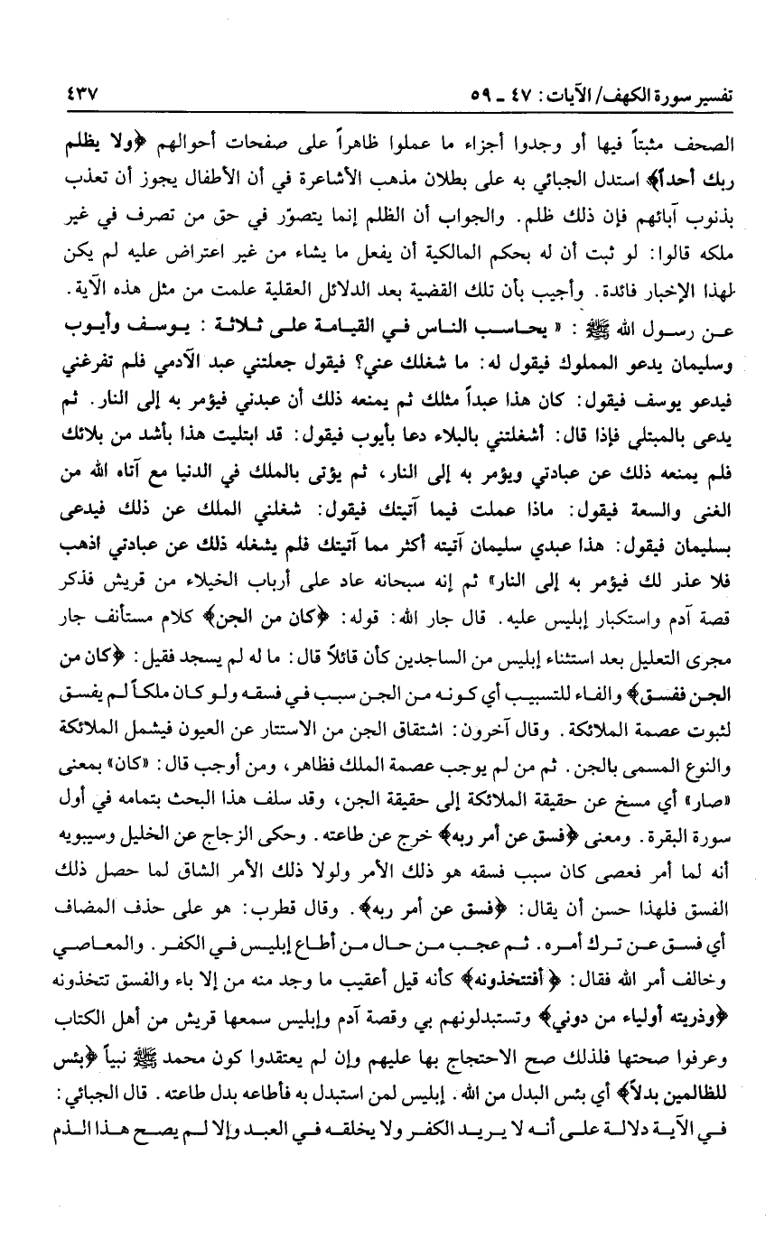 ثم إنه سبحانه عاد على أرباب الخيلاء من قريش فذكر قصة آدم واستكبار إبليس عليه. قال جار الله: قوله: كانَ مِنَ الْجِنِّ كلام مستأنف جار مجرى التعليل بعد استثناء إبليس من الساجدين كأن قائلا قال: ما له لم يسجد فقيل: كانَ مِنَ الْجِنِّ فَفَسَقَ والفاء للتسبيب أي كونه من الجن سبب في فسقه ولو كان ملكا لم يفسق لثبوت عصمة الملائكة. وقال آخرون: اشتقاق الجن من الاستتار عن العيون فيشمل الملائكة والنوع المسمى بالجن. ثم من لم يوجب عصمة الملك فظاهر، ومن أوجب قال: «كان» بمعنى «صار» أي مسخ عن حقيقة الملائكة إلى حقيقة الجن، وقد سلف هذا البحث بتمامه في أول سورة البقرة. ومعنى فَفَسَقَ عَنْ أَمْرِ رَبِّهِ خرج عن طاعته. وحكى الزجاج عن الخليل وسيبويه أنه لما أمر فعصى كان سبب فسقه هو ذلك الأمر ولولا ذلك الأمر الشاق لما حصل ذلك الفسق فلهذا حسن أن يقال: فَفَسَقَ عَنْ أَمْرِ رَبِّهِ. وقال قطرب: هو على حذف المضاف أي فسق عن ترك أمره. ثم عجب من حال من أطاع إبليس في الكفر. والمعاصي وخالف أمر الله فقال: أَفَتَتَّخِذُونَهُ كأنه قيل أعقيب ما وجد منه من إلا باء والفسق تتخذونه وَذُرِّيَّتَهُ أَوْلِياءَ مِنْ دُونِي وتستبدلونهم بي وقصة آدم وإبليس سمعها قريش من أهل الكتاب وعرفوا صحتها فلذلك صح الاحتجاج بها عليهم وإن لم يعتقدوا كون محمد صلى الله عليه وسلم نبيا بِئْسَ لِلظَّالِمِينَ بَدَلًا أي بئس البدل من الله. إبليس لمن استبدل به فأطاعه بدل طاعته. قال الجبائي: