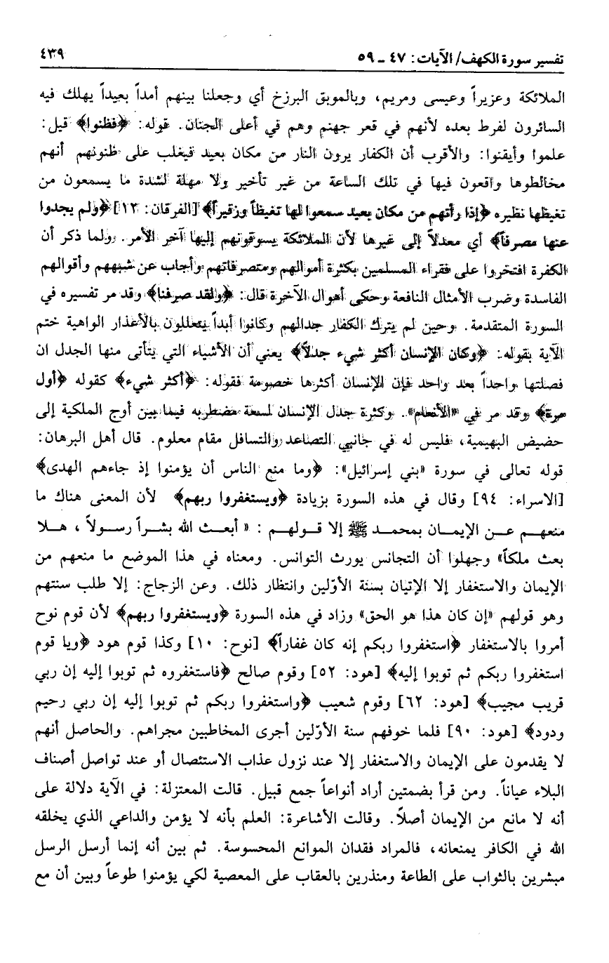 قوله تعالى في سورة «بني إسرائيل» : وَما مَنَعَ النَّاسَ أَنْ يُؤْمِنُوا إِذْ جاءَهُمُ الْهُدى [الاسراء: 94] وقال في هذه السورة بزيادة وَيَسْتَغْفِرُوا رَبَّهُمْ لأن المعنى هناك ما منعهم عن الإيمان بمحمد صلى الله عليه وسلم إلا قولهم: «أبعث الله بشرا رسولا، هلا بعث ملكا» وجهلوا أن التجانس يورث التوانس. ومعناه في هذا الموضع ما منعهم من الإيمان والاستغفار إلا الإتيان بسنة الأوّلين وانتظار ذلك. وعن الزجاج: إلا طلب سنتهم وهو قولهم «إن كان هذا هو الحق» وزاد في هذه السورة وَيَسْتَغْفِرُوا رَبَّهُمْ لأن قوم نوح أمروا بالاستغفار اسْتَغْفِرُوا رَبَّكُمْ إِنَّهُ كانَ غَفَّاراً [نوح: 10] وكذا قوم هود وَيا قَوْمِ اسْتَغْفِرُوا رَبَّكُمْ ثُمَّ تُوبُوا إِلَيْهِ [هود: 52] وقوم صالح فَاسْتَغْفِرُوهُ ثُمَّ تُوبُوا إِلَيْهِ إِنَّ رَبِّي قَرِيبٌ مُجِيبٌ [هود: 62] وقو شعيب وَاسْتَغْفِرُوا رَبَّكُمْ ثُمَّ تُوبُوا إِلَيْهِ إِنَّ رَبِّي رَحِيمٌ وَدُودٌ [هود: 90] فلما خوفهم سنة الأوّلين أجرى المخاطبين مجراهم. والحاصل أنهم لا يقدمون على الإيمان والاستغفار إلا عند نزول عذاب الاستئصال أو عند تواصل أصناف البلاء عيانا. ومن قرأ بضمتين أراد أنواعا جمع قبيل. قالت المعتزلة: في الآية دلالة على أنه لا مانع من الإيمان أصلا. وقالت الأشاعرة: العلم بأنه لا يؤمن والداعي الذي يخلقه الله في الكافر يمنعانه، فالمراد فقدان الموانع المحسوسة. ثم بين أنه إنما أرسل الرسل مبشرين بالثواب على الطاعة ومنذرين بالعقاب على المعصية لكي يؤمنوا طوعا وبين أن مع