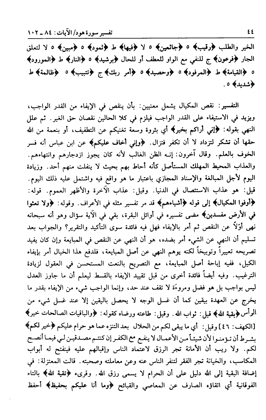 أَوْفُوا الْمِكْيالَ إلى قوله أَشْياءَهُمْ قد مر تفسير مثله في الأعراف. وقوله: وَلا تَعْثَوْا فِي الْأَرْضِ مُفْسِدِينَ مضى تفسيره في أوائل البقرة، بقي في الآية سؤال وهو أنه سبحانه نهى أوّلا عن النقص ثم أمر بالإيفاء فهل فيه فائدة سوى التأكيد والتقرير؟ والجواب بعد تسليم أن النهي عن الشيء أمر بضده، هو أن النهي عن النقص في المبايعة وإن كان يفيد تصريحه تعييرا وتوبيخا لكنه يوهم النهي عن أصل المبايعة، فلدفع هذا الخيال أمر بإيفاء الكيل، ففيه إباحة أصل المبايعة، مع التصريح بالنعت المستحسن في العقول لزيادة الترغيب. وفيه أيضا فائدة أخرى من قبل تقييد الإيفاء بالقسط ليعلم أن ما جاوز العدل ليس بواجب بل هو فضل ومروءة لا تقف عند حد، وإنما الواجب شيء من الإيفاء بقدر ما يخرج عن العهدة بيقين كما أن غسل الوجه لا يحصل باليقين إلا عند غسل شيء من الرأس بَقِيَّتُ اللَّهِ قيل: ثواب الله. وقيل: طاعته ورضاه كقوله: وَالْباقِياتُ الصَّالِحاتُ خَيْرٌ [الكهف: 46] وقيل: أي ما يبقى لكم من الحلال بعد التنزه عما هو حرام عليكم خَيْرٌ لَكُمْ بشرط أن تؤمنوا لأن شيئا من الأعمال لا ينفع مع الكفر إن كنتم مصدقين لي فيما أنصح لكم. ولا ريب أن الأمانة تجر الرزق لاعتماد الناس وإقبالهم عليه فينفتح له أبواب المكاسب، والخيانة تجر الفقر لتنفر الناس عنه وعن معاملته وصحبته. قالت المعتزلة: في إضافة البقية إلى الله دليل على أن الحرام لا يسمى رزق الله. وقرىء تقاة الله بالتاء الفوقانية أي اتقاؤه الصارف عن المعاصي والقبائح وَما أَنَا عَلَيْكُمْ بِحَفِيظٍ أحفظ