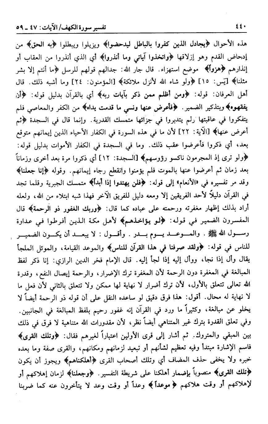 وَلَوْ تَرى إِذِ الْمُجْرِمُونَ ناكِسُوا رُؤُسِهِمْ [السجدة: 12] أي ذكروا مرة بعد أخرى وزمانا بعد زمان ثم أعرضوا عنها بالموت فلم يؤمنوا وانقطع رجاء إيمانهم. وقوله إِنَّا جَعَلْنا وقد مر تفسيره في «الأنعام» إلى قوله: فَلَنْ يَهْتَدُوا إِذاً أَبَداً متمسك الجبرية وقلما تجد في القرآن دليلا لأحد الفريقين إلا ومعه دليل للفريق الآخر فهذا شبه ابتلاء من الله، ولعله أراد بذلك إظهار مغفرته ورحمته على عباده كما قال: وَرَبُّكَ الْغَفُورُ ذُو الرَّحْمَةِ قال المفسرون الضمير في قوله: لَوْ يُؤاخِذُهُمْ لأهل مكة الذين أفرطوا في عداوة رسول الله صلى الله عليه وسلم. والموعد يوم بدر. وأقول: لا يبعد أن يكون الضمير للناس في قوله: وَلَقَدْ صَرَّفْنا فِي هذَا الْقُرْآنِ لِلنَّاسِ والموعد القيامة، والموئل الملجأ يقال وأل إذا نجا، ووأل إليه إذا لجأ إليه. قال الإمام فخر الدين الرازي: إنا ذكر لفظ المبالغة في المغفرة دون الرحمة لأن المغفرة ترك الإضرار، والرحمة إيصال النفع، وقدرة الله تعالى تتعلق بالأول، لأن ترك أضرار لا نهاية لها ممكن ولا تتعلق بالثاني لأن فعل ما لا نهاية له محال. أقول: هذا فرق دقيق لو ساعده النقل على أن قوله ذو الرحمة أيضا لا يخلو عن مبالغة، وكثيرا ما ورد في القرآن إنه غفور رحيم بلفظ المبالغة في الجانبين.