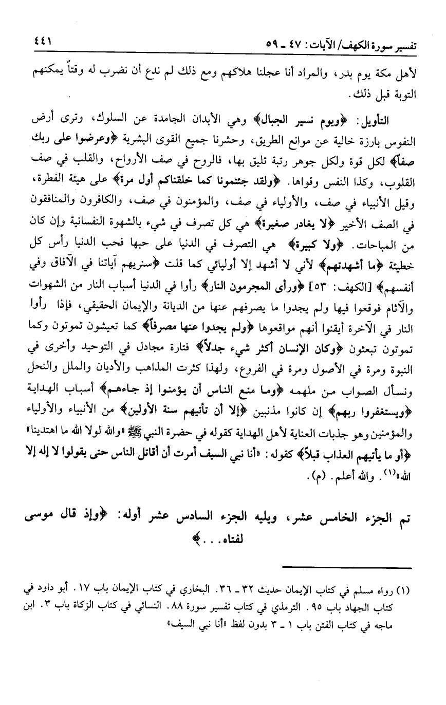 تم الجزء الخامس عشر، ويليه الجزء السادس عشر أوله: وَإِذْ قالَ مُوسى لِفَتاهُ ...