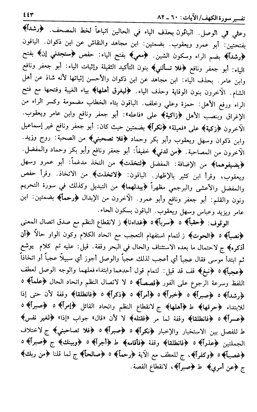 حُقُباً هـ سَرَباً هـ غَداءَنا ز لا نقطاع النظم مع صدق اتصال المعنى نَصَباً هـ الْحُوتَ ز لتمام استفهام التعجب مع اتحاد الكلام وكون الواو حالا أَنْ أَذْكُرَهُ ج لاحتمال ما بعده الاستئناف والحال في البحر وقفة. قيل: عليه تم كلام يوشع ثم ابتدأ موسى فقال عجبا أي أعجب لذلك عجبا والوصل أجوز أي سبيلا عجبا واتخاذا عَجَباً هـ نَبْغِ قف قد قيل: لتمام قول أحدهما وابتداء فعلهما والوجه الوصل لعطف اللفظ وسرعة الرجوع على الفور قَصَصاً هـ لا لاتصال النظم واتحاد الحال عِلْماً هـ رُشْداً هـ صَبْراً هـ خُبْراً هـ أَمْراً هـ ذِكْراً هـ فَانْطَلَقا وقفة لأن حتى إذا للابتداء حرقها ط أَهْلَها ج لانقطاع النظم واتحاد القائل إِمْراً هـ صَبْراً هـ عُسْراً هـ فَانْطَلَقا وقفة لما مر فَقَتَلَهُ لا لأن «قال» جواب «إذا» لغير نفس ط للفصل بين الاستخبار والإخبار نُكْراً هـ صَبْراً هـ فَلا تُصاحِبْنِي ج لاختلاف الجملتين عُذْراً هـ فَانْطَلَقا وقفة فَأَقامَهُ ط أَجْراً هـ وَبَيْنِكَ ج صَبْراً هـ غَصْباً هـ وَكُفْراً، ج للعطف مع الآية رُحْماً هـ صالِحاً ج لما قلنا مِنْ رَبِّكَ ج عَنْ أَمْرِي ط صَبْراً، لانقطاع القصة.