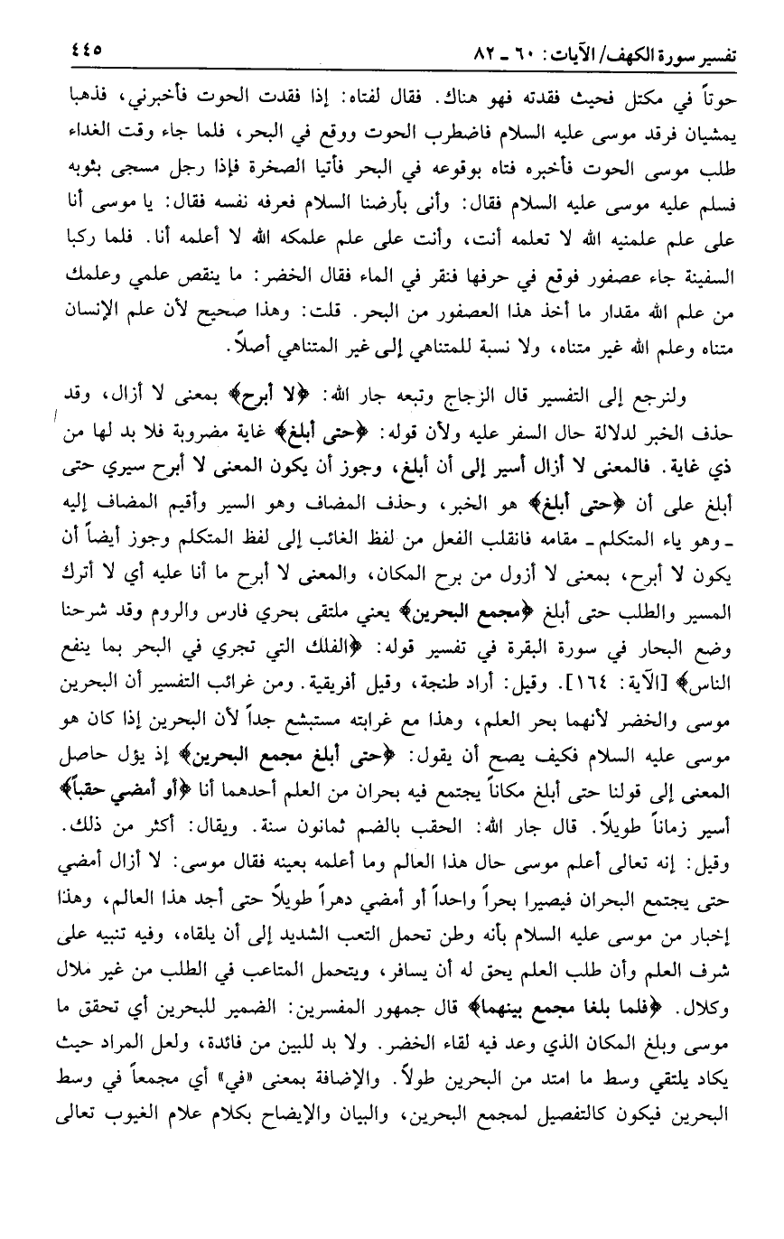 ولنرجع إلى التفسير قال الزجاج وتبعه جار الله: لا أَبْرَحُ بمعنى لا أزال، وقد حذف الخبر لدلالة حال السفر عليه ولأن قوله: حَتَّى أَبْلُغَ غاية مضروبة فلا بد لها من ذي غاية. فالمعنى لا أزال أسير إلى أن أبلغ، وجوز أن يكون المعنى لا أبرح سيري حتى أبلغ على أن حَتَّى أَبْلُغَ هو الخبر، وحذف المضاف وهو السير وأقيم المضاف إليه- وهو ياء المتكلم- مقامه فانقلب الفعل من لفظ الغائب إلى لفظ المتكلم وجوز أيضا أن يكون لا أبرح، بمعنى لا أزول من برح المكان، والمعنى لا أبرح ما أنا عليه أي لا أترك المسير والطلب حتى أبلغ مَجْمَعَ الْبَحْرَيْنِ يعني ملتقى بحري فارس والروم وقد شرحنا وضع البحار في سورة البقرة في تفسير قوله: الْفُلْكِ الَّتِي تَجْرِي فِي الْبَحْرِ بِما يَنْفَعُ النَّاسَ [الآية: 164] . وقيل: أراد طنجة، وقيل إفريقية. ومن غرائب التفسير أن البحرين موسى والخضر لأنهما بحر العلم، وهذا مع غرابته مستبشع جدا لأن البحرين إذا كان هو موسى عليه السلام فكيف يصح أن يقول: حَتَّى أَبْلُغَ مَجْمَعَ الْبَحْرَيْنِ إذ يؤل حاصل المعنى إلى قولنا حتى أبلغ مكانا يجتمع فيه بحران من العلم أحدهما أنا أَوْ أَمْضِيَ حُقُباً أسير زمانا طويلا. قال جار الله: الحقب بالضم ثمانون سنة. ويقال: أكثر من ذلك.