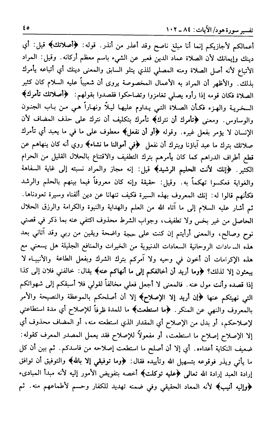 أعمالكم لأجازيكم إنما أنا مبلغ ناصح وقد أعذر من أنذر. قوله: أَصَلاتُكَ قيل: أي دينك وإيمانك لأن الصلاة عماد الدين فعبر عن الشيء باسم معظم أركانه. وقيل: المراد الأتباع لأن أصل الصلاة ومنه المصلي للذي يتلو السابق والمعنى دينك أي أتباعه يأمرك بذلك. والأظهر أن المراد به الأعمال المخصوصة