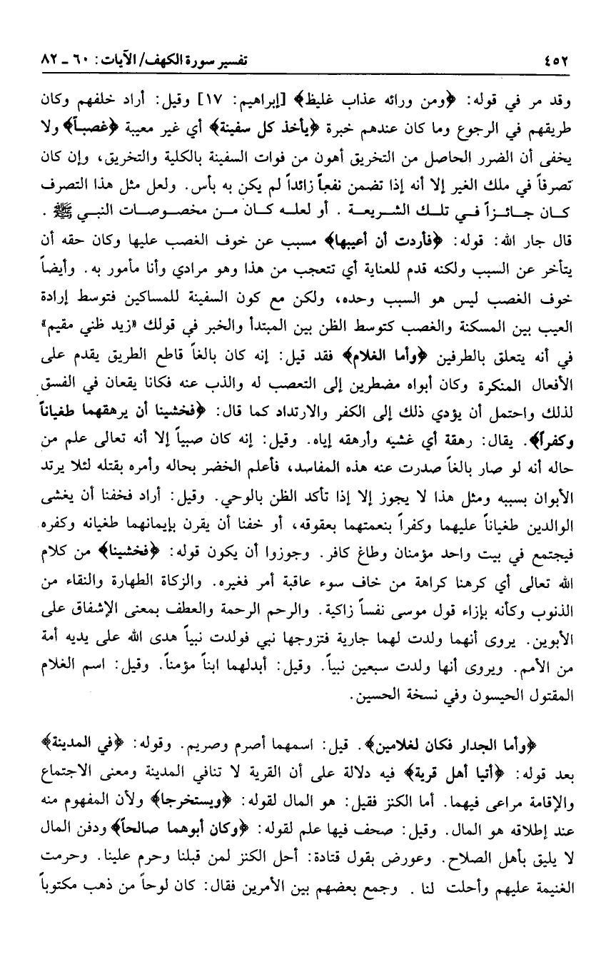 قال جار الله: قوله: فَأَرَدْتُ أَنْ أَعِيبَها مسبب عن خوف الغصب عليها وكان حقه أن يتأخر عن السبب ولكنه قدم للعناية أي تتعجب من هذا وهو مرادي وأنا مأمور به. وأيضا خوف الغصب ليس هو السبب وحده، ولكن مع كون السفينة للمساكين فتوسط إرادة العيب بين المسكنة والغصب كتوسط الظن بين المبتدأ والخبر في قولك «زيد ظني مقيم» في أنه يتعلق بالطرفين وَأَمَّا الْغُلامُ فقد قيل: إنه كان بالغا قاطع الطريق يقدم على الأفعال المنكرة وكان أبواه مضطرين إلى التعصب له والذب عنه فكانا يقعان في الفسق لذلك واحتمل أن يؤدي ذلك إلى الكفر والارتداد كما قال: فَخَشِينا أَنْ يُرْهِقَهُما طُغْياناً وَكُفْراً. يقال: رهقة أي غشيه وأرهقه إياه. وقيل: إنه كان صبيا إلا أنه تعالى علم من حاله أنه لو صار بالغا صدرت عنه هذه المفاسد، فأعلم الخضر بحاله وأمره بقتله لئلا يرتد الأبوان بسببه ومثل هذا لا يجوز إلا إذا تأكد الظن بالوحي. وقيل: أراد فخفنا أن يغشى الوالدين طغيانا عليهما وكفرا بنعمتهما بعقوقه، أو خفنا أن يقرن بإيمانهما طغيانه وكفره فيجتمع في بيت واحد مؤمنان وطاغ كافر. وجوزوا أن يكون قوله: فَخَشِينا من كلام الله تعالى أي كرهنا كراهة من خاف سوء عاقبة أمر فغيره. والزكاة الطهارة والنقاء من الذنوب وكأنه بإزاء قول موسى نفسا زاكية. والرحم الرحمة والعطف بمعنى الإشفاق على الأبوين. يروى أنهما ولدت لهما جارية فتزوجها نبي فولدت نبيا هدى الله على يديه أمة من الأمم. ويروى أنها ولدت سبعين نبيا. وقيل: أبدلهما أبدلهما أبنا مؤمنا. وقيل: اسم الغلام المقتول الحيسون وفي نسخة الحسين.