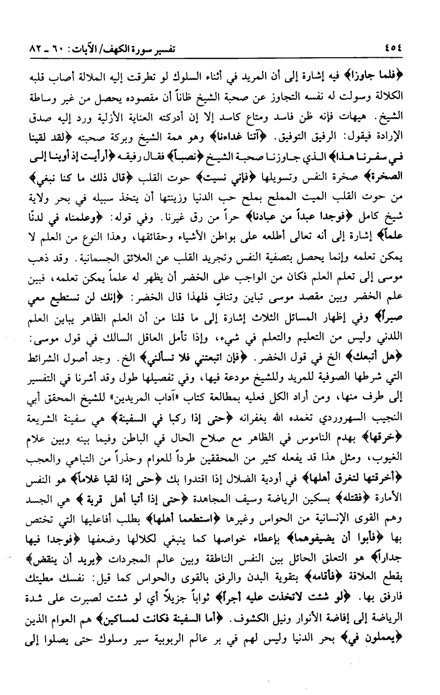 هَلْ أَتَّبِعُكَ إلخ في قول الخضر. فإن اتبعتني فلا تسألني إلخ. وجد أصول الشرائط التي شرطها الصوفية للمريد وللشيخ مودعة فيها، وفي تفصيلها طول وقد أشرنا في التفسير إلى طرف منها، ومن أراد الكل فعليه بمطالعة كتاب «آداب المريدين» للشيخ المحقق أبي النجيب السهروردي تغمده الله بغفرانه حَتَّى إِذا رَكِبا فِي السَّفِينَةِ هي سفينة الشريعة خَرَقَها بهدم الناموس في الظاهر مع صلاح الحال في الباطن وفيما بينه وبين علام الغيوب، ومثل هذا قد يفعله كثير من المحققين طردا للعوام وحذرا من التباهي والعجب أَخَرَقْتَها لِتُغْرِقَ أَهْلَها في أودية الضلال إذا اقتدوا بك حَتَّى إِذا لَقِيا غُلاماً هو النفس الأمارة فَقَتَلَهُ بسكين الرياضة وسيف المجاهدة حَتَّى إِذا أَتَيا أَهْلَ قَرْيَةٍ هي الجسد وهم القوى الإنسانية من الحواس وغيرها اسْتَطْعَما أَهْلَها بطلب أفاعيلها التي تختص بها فَأَبَوْا أَنْ يُضَيِّفُوهُما بإعطاء خواصها كما ينبغي لكلالها وضعفها فَوَجَدا فِيها جِداراً هو التعلق الحائل بين النفس الناطقة وبين عالم المجردات يُرِيدُ أَنْ يَنْقَضَّ بقطع العلاقة فَأَقامَهُ بتقوية البدن والرفق بالقوى والحواس كما قيل: نفسك مطيتك فارفق بها. لَوْ شِئْتَ لَاتَّخَذْتَ عَلَيْهِ أَجْراً ثوابا جزيلا أي لو شئت لصبرت على شدة الرياضة إلى إفاضة الأنوار ونيل الكشوف. أَمَّا السَّفِينَةُ فَكانَتْ لِمَساكِينَ هم العوام الذين يَعْمَلُونَ فِي بحر الدنيا وليس لهم في بر عالم الربوبية سير وسلوك حتى يصلوا إلى