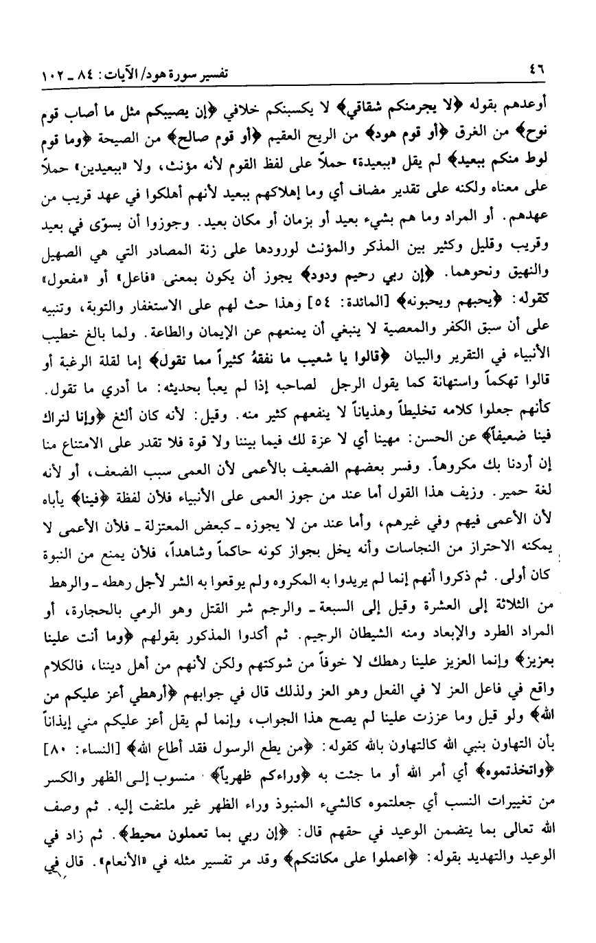 أوعدهم بقوله لا يَجْرِمَنَّكُمْ شِقاقِي لا يكسبنكم خلافي أَنْ يُصِيبَكُمْ مِثْلُ ما أَصابَ قَوْمَ نُوحٍ من الغرق أَوْ قَوْمَ هُودٍ من الريح العقيم أَوْ قَوْمَ صالِحٍ من الصيحة وَما قَوْمُ لُوطٍ مِنْكُمْ بِبَعِيدٍ لم يقل «ببعيدة» حملا على لفظ القوم لأنه مؤنث، ولا «ببعيدين» حملا على معناه ولكنه على تقدير مضاف أي وما إهلاكهم ببعيد لأنهم أهلكوا في عهد قريب من عهدهم. أو المراد وما هم بشيء بعيد أو بزمان أو مكان بعيد. وجوزوا أن بسوّى في بعيد وقريب وقليل وكثير بين المذكر والمؤنث لورودها على زنة المصادر التي هي الصهيل والنهيق ونحوهما. إِنَّ رَبِّي رَحِيمٌ وَدُودٌ يجوز أن يكون بمعنى «فاعل» أو «مفعول» كقوله: يُحِبُّهُمْ وَيُحِبُّونَهُ [المائدة: 54] وهذا حث لهم على الاستغفار والتوبة، وتنبيه على أن سبق الكفر والمعصية لا ينبغي أن يمنعهم عن الإيمان والطاعة. ولما بالغ خطيب الأنبياء في التقرير والبيان قالُوا يا شُعَيْبُ ما نَفْقَهُ كَثِيراً مِمَّا تَقُولُ إما لقلة الرغبة أو قالوا تهكما واستهانة كما يقول الرجل لصاحبه إذا لم يعبا بحديثه: ما أدري ما تقول.