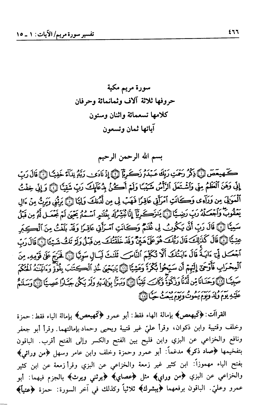 كهيعص بإمالة الهاء فقط: أبو عمرو كهيعص بإمالة الياء فقط: حمزة وخلف وقتيبة وابن ذكوان، وقرأ عليّ غير قتيبة ويحيى وحماد بإمالتهما. وقرأ أبو جعفر ونافع والخزاعي عن البزي وابن فليح بين الفتح والكسر وإلى الفتح أقرب. الباقون بتفخيمها كهيعص ذِكْرُ مدغما: أبو عمرو وحمزة وخلف وابن عامر وسهل مِنْ وَرائِي بفتح الياء مهموزا: ابن كثير غير زمعة والخزاعي عن البزي وقرأ زمعة عن ابن كثير والخزاعي عن البزي من وراي مثل عَصايَ يرثني ويرث بالجزم فيهما: أبو عمرو وعليّ. الباقون برفعهما يبشرك ثلاثيا وكذلك في آخر السورة: حمزة عِتِيًّا