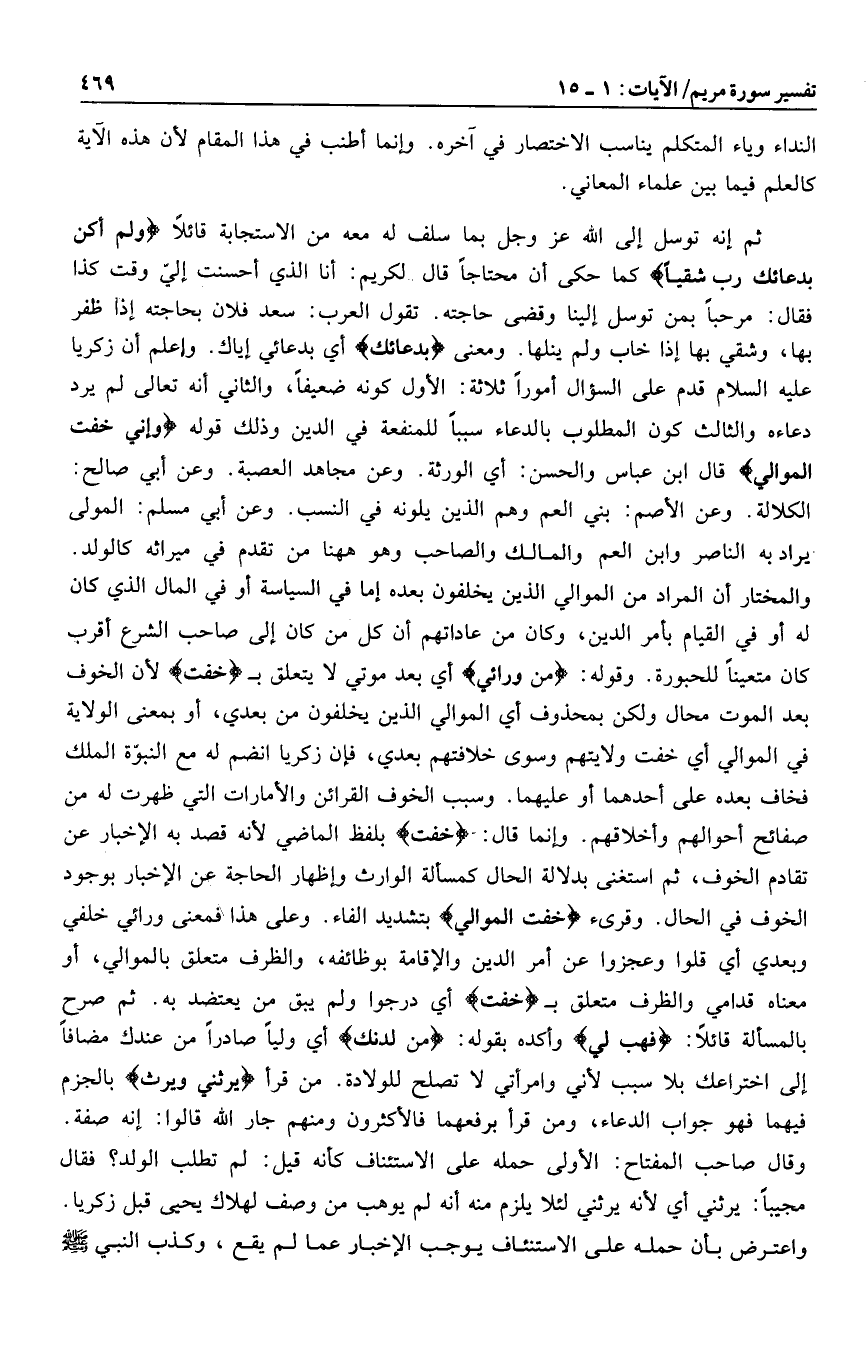 ثم إنه توسل إلى الله عز وجل بما سلف له معه من الاستجابة قائلا وَلَمْ أَكُنْ بِدُعائِكَ رَبِّ شَقِيًّا كما حكى أن محتاجا قال لكريم: أنا الذي أحسنت إليّ وقت كذا فقال: مرحبا بمن توسل إلينا وقضى حاجته. تقول العرب: سعد فلان بحاجته إذا ظفر بها، وشقي بها إذا خاب ولم ينلها. ومعنى بِدُعائِكَ أي بدعائي إياك. واعلم أن زكريا عليه السلام قدم على السؤال أمورا ثلاثة: الأول كونه ضعيفا، والثاني أنه تعالى لم يرد دعاءه والثالث كون المطلوب بالدعاء سببا للمنفعة في الدين وذلك قوله وَإِنِّي خِفْتُ الْمَوالِيَ قال ابن عباس والحسن: أي الورثة. وعن مجاهد العصبة. وعن أبي صالح: