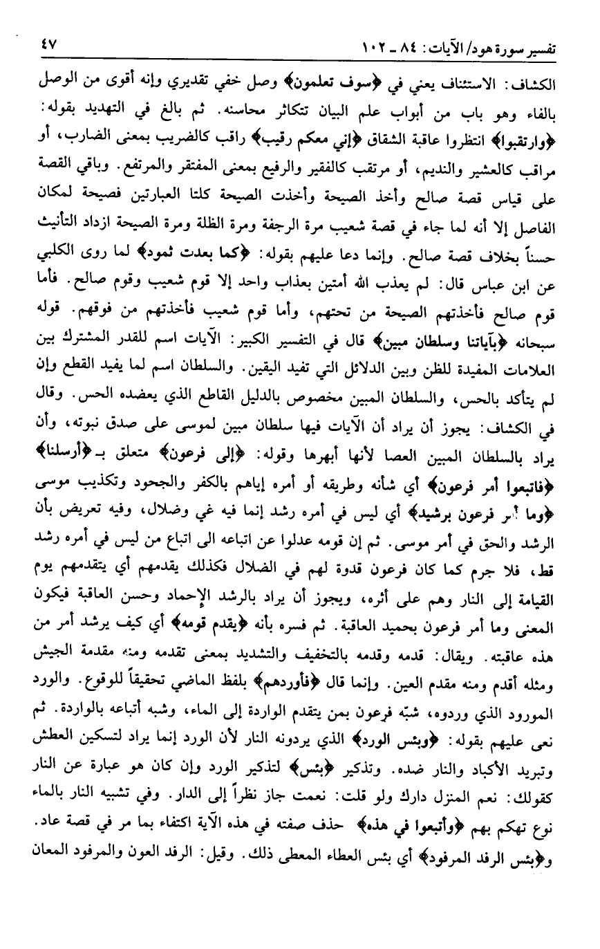 وَارْتَقِبُوا انتظروا عاقبة الشقاق إِنِّي مَعَكُمْ رَقِيبٌ راقب كالضريب بمعنى الضارب، أو مراقب كالعشير والنديم، أو مرتقب كالفقير والرفيع بمعنى المفتقر والمرتفع. وباقي القصة على قياس قصة صالح وأخذ الصيحة وأخذت الصيحة كلتا العبارتين فصيحة لمكان الفاصل إلا أنه لما جاء في قصة شعيب مرة الرجفة ومرة الظلة ومرة الصيحة ازداد التأنيث حسنا بخلاف قصة صالح. وإنما دعا عليهم بقوله: كَما بَعِدَتْ ثَمُودُ لما روى الكلبي عن ابن عباس قال: لم يعذب الله أمتين بعذاب واحد إلا قوم شعيب وقوم صالح. فأما قوم صالح فأخذتهم الصيحة من تحتهم، وأما قوم شعيب فأخذتهم من فوقهم. قوله سبحانه بِآياتِنا وَسُلْطانٍ مُبِينٍ قال في التفسير الكبير: الآيات اسم للقدر المشترك بين العلامات المفيدة للظن وبين الدلائل التي تفيد اليقين. والسلطان اسم لما يفيد القطع وإن لم يتأكد بالحس، والسلطان المبين مخصوص بالدليل القاطع الذي يعضده الحس. وقال في الكشاف: يجوز أن يراد أن الآيات فيها سلطان مبين لموسى على صدق نبوته، وأن يراد بالسلطان المبين العصا لأنها أبهرها وقوله: إِلى فِرْعَوْنَ متعلق ب أَرْسَلْنا فَاتَّبَعُوا أَمْرَ فِرْعَوْنَ أي شأنه وطريقه أو أمره إياهم بالكفر والجحود وتكذيب موسى وَما أَمْرُ فِرْعَوْنَ بِرَشِيدٍ أي ليس في أمره رشد إنما فيه غي وضلال، وفيه تعريض بأن الرشد والحق في أمر موسى. ثم إن قومه عدلوا عن اتباعه الى اتباع من ليس في أمره رشد قط، فلا جرم كما كان فرعون قدوة لهم في الضلال فكذلك يقدمهم أي يتقدمهم يوم القيامة إلى النار وهم على أثره، ويجوز أن يراد بالرشد الإحماد وحسن العاقبة فيكون المعنى وما أمر فرعون بحميد العاقبة. ثم فسره بأنه يَقْدُمُ قَوْمَهُ أي كيف يرشد أمر من هذه عاقبته. ويقال: قدمه وقدمه بالتخفيف والتشديد بمعنى تقدمه ومنه مقدمة الجيش ومثله أقدم ومنه مقدم العين. وإنما قال فَأَوْرَدَهُمُ بلفظ الماضي تحقيقا للوقوع. والورد المورود الذي وردوه، شبّه فرعون بمن يتقدم الواردة إلى الماء، وشبه أتباعه بالواردة. ثم نعى عليهم بقوله: وَبِئْسَ الْوِرْدُ الذي يردونه النار لأن الورد إنما يراد لتسكين العطش وتبريد الأكباد والنار ضده. وتذكير بِئْسَ لتذكير الورد وإن كان هو عبارة عن النار كقولك: نعم المنزل دارك ولو قلت: نعمت جاز نظرا إلى الدار. وفي تشبيه النار بالماء نوع تهكم بهم وَأُتْبِعُوا فِي هذِهِ حذف صفته في هذه الآية اكتفاء بما مر في قصة عاد.