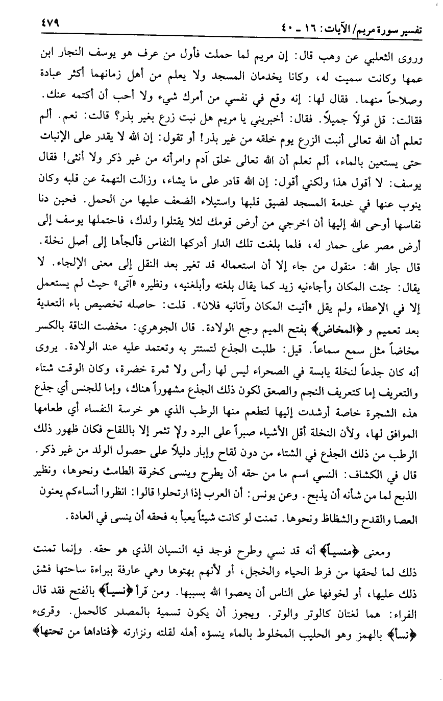 فقالت: قل قولا جميلا. فقال: أخبريني يا مريم هل نبت زرع بغير بذر؟ قالت: نعم. ألم تعلم أن الله تعالى أنبت الزرع يوم خلقه من غير بذر! أو تقول: إن الله لا يقدر على الإنبات حتى يستعين بالماء، ألم تعلم أن الله تعالى خلق آدم وامرأته من غير ذكر ولا أنثى! فقال يوسف: لا أقول هذا ولكني أقول: إن الله قادر على ما يشاء، وزالت التهمة عن قلبه وكان ينوب عنها في خدمة المسجد لضيق قلبها واستيلاء الضعف عليها من الحمل. فحين دنا نفاسها أوحى الله إليها أن اخرجي من أرض قومك لئلا يقتلوا ولدك، فاحتملها يوسف إلى أرض مصر على حمار له، فلما بلغت تلك الدار أدركها النفاس فألجأها إلى أصل نخلة.
