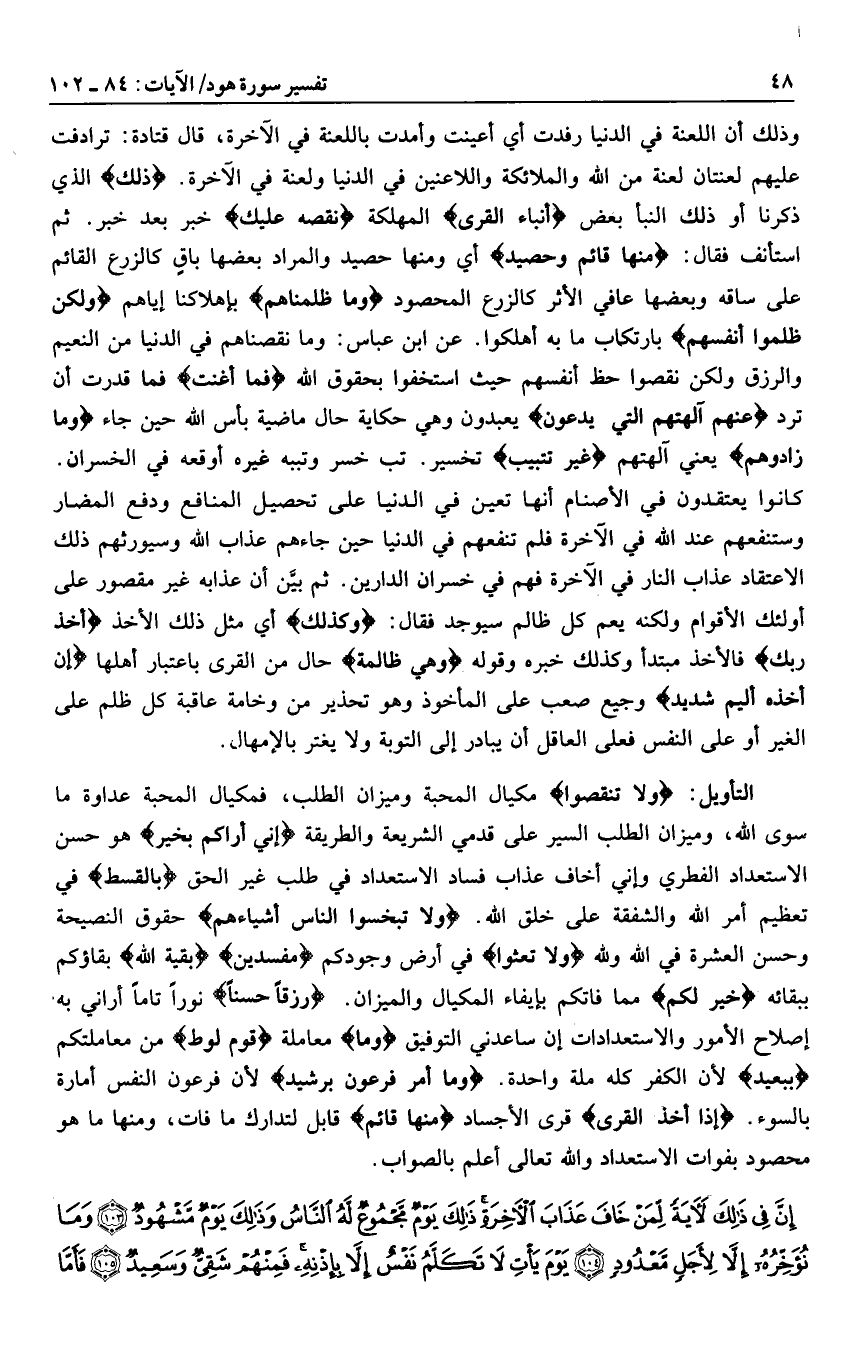 وَلا تَنْقُصُوا مكيال المحبة وميزان الطلب، فمكيال المحبة عداوة ما سوى الله، وميزان الطلب السير على قدمي الشريعة والطريقة إِنِّي أَراكُمْ بِخَيْرٍ هو حسن الاستعداد الفطري وإني أخاف عذاب فساد الاستعداد في طلب غير الحق بِالْقِسْطِ في تعظيم أمر الله والشفقة على خلق الله. وَلا تَبْخَسُوا النَّاسَ أَشْياءَهُمْ حقوق النصيحة وحسن العشرة في الله ولله وَلا تَعْثَوْا في أرض وجودكم مُفْسِدِينَ بَقِيَّتُ اللَّهِ بقاؤكم ببقائه خَيْرٌ لَكُمْ مما فاتكم بإيفاء المكيال والميزان. رِزْقاً حَسَناً نورا تاما أراني به إصلاح الأمور والاستعدادات إن ساعدني التوفيق وَما معاملة قَوْمُ لُوطٍ من معاملتكم بِبَعِيدٍ لأن الكفر كله ملة واحدة. وَما أَمْرُ فِرْعَوْنَ بِرَشِيدٍ لأن فرعون النفس أمارة بالسوء. إِذا أَخَذَ الْقُرى قرى الأجساد مِنْها قائِمٌ قابل لتدارك ما فات، ومنها ما هو محصود بفوات الاستعداد والله تعالى أعلم بالصواب.