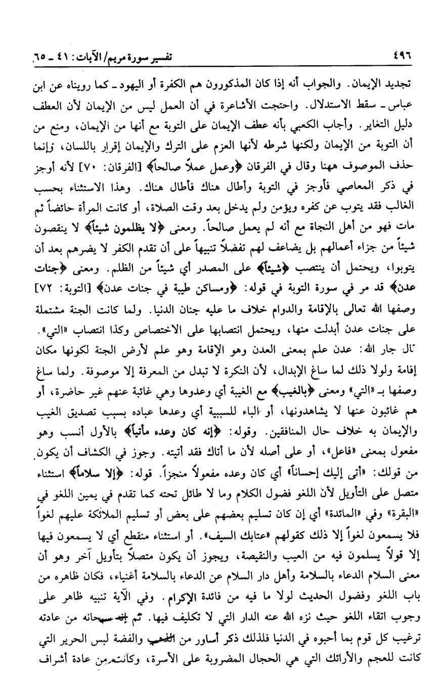 تجديد الإيمان. والجواب أنه إذا كان المذكورون هم الكفرة أو اليهود- كما رويناه عن ابن عباس- سقط الاستدلال. واحتجت الأشاعرة في أن العمل ليس من الإيمان لأن العطف دليل التغاير. وأجاب الكعبي بأنه عطف الإيمان على التوبة مع أنها من الإيمان، ومنع من أن التوبة من الإيمان ولكنها شرطه لأنها العزم على الترك والإيمان إقرار باللسان، وإنما حذف الموصوف هاهنا وقال في الفرقان وَعَمِلَ عَمَلًا صالِحاً [الفرقان: 70] لأنه أوجز في ذكر المعاصي فأوجز في التوبة وأطال هناك فأطال هناك. وهذا الاستثناء بحسب الغالب فقد يتوب عن كفره ويؤمن ولم يدخل بعد وقت الصلاة، أو كانت المرأة حائضا ثم مات فهو من أهل النجاة مع أنه لم يعمل صالحا. ومعنى لا يُظْلَمُونَ شَيْئاً لا ينقصون شيئا من جزاء أعمالهم بل يضاعف لهم تفضلا تنبيها على أن تقدم الكفر لا يضرهم بعد أن يتوبوا، ويحتمل أن ينتصب شَيْئاً على المصدر أي شيئا من الظلم. ومعنى جَنَّاتِ عَدْنٍ قد مر في سورة التوبة في قوله: وَمَساكِنَ طَيِّبَةً فِي جَنَّاتِ عَدْنٍ [التوبة: 72] وصفها الله تعالى بالإقامة والدوام خلاف ما عليه جنان الدنيا. ولما كانت الجنة مشتملة على جنات عدن أبدلت منها، ويحتمل انتصابها على الاختصاص وكذا انتصاب «التي» .