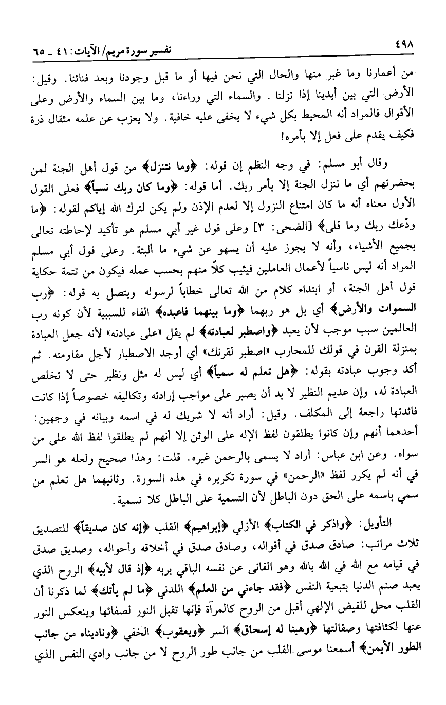 وَاذْكُرْ فِي الْكِتابِ الأزلي إِبْراهِيمَ القلب إِنَّهُ كانَ صِدِّيقاً للتصديق ثلاث مراتب: صادق صدق في أقواله، وصادق صدق في أخلاقه وأحواله، وصديق صدق في قيامه مع الله في الله بالله وهو الفاني عن نفسه الباقي بربه إِذْ قالَ لِأَبِيهِ