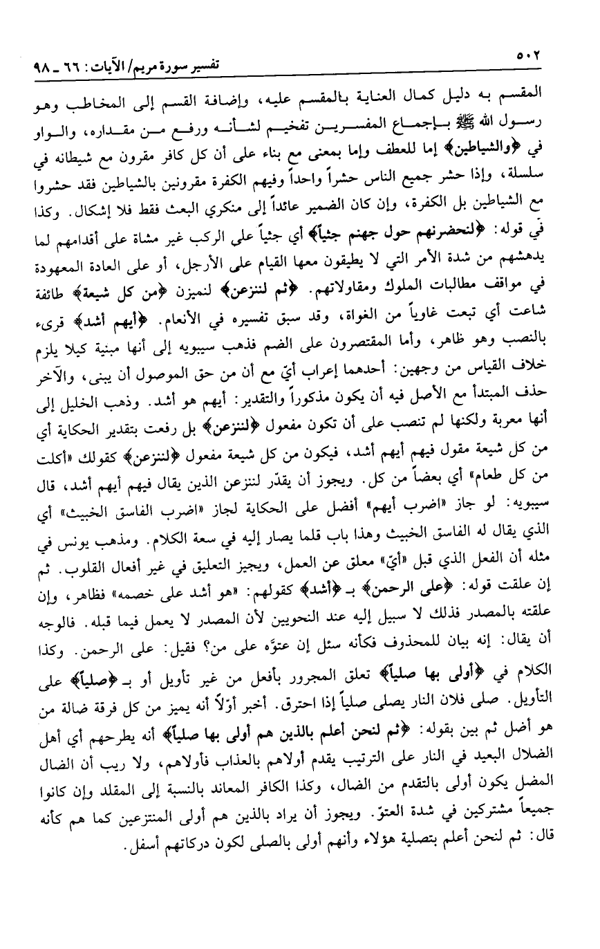 المقسم به دليل كمال العناية بالمقسم عليه، وإضافة القسم إلى المخاطب وهو رسول الله صلى الله عليه وسلم بإجماع المفسرين تفخيم لشأنه ورفع من مقداره، والواو في وَالشَّياطِينَ إما للعطف وإما بمعنى مع بناء على أن كل كافر مقرون مع شيطانه في سلسلة، وإذا حشر جميع الناس حشرا واحدا وفيهم الكفرة مقرونين بالشياطين فقد حشروا مع الشياطين بل الكفرة، وإن كان الضمير عائدا إلى منكري البعث فقط فلا إشكال. وكذا في قوله: لَنُحْضِرَنَّهُمْ حَوْلَ جَهَنَّمَ جِثِيًّا أي جثيا على الركب غير مشاة على أقدامهم لما يدهشهم من شدة الأمر التي لا يطيقون معها القيام على الأرجل، أو على العادة المعهودة في مواقف مطالبات الملوك ومقاولاتهم. ثُمَّ لَنَنْزِعَنَّ لنميزن مِنْ كُلِّ شِيعَةٍ طائفة شاعت أي تبعت غاويا من الغواة، وقد سبق تفسيره في الأنعام. أَيُّهُمْ أَشَدُّ قرىء بالنصب وهو ظاهر، وأما المقتصرون على الضم فذهب سيبويه إلى أنها مبنية كيلا يلزم خلاف القياس من وجهين: أحدهما إعراب أيّ مع أن من حق الموصول أن يبنى، والآخر حذف المبتدأ مع الأصل فيه أن يكون مذكورا والتقدير: أيهم هو أشد. وذهب الخليل إلى أنها معربة ولكنها لم تنصب على أن تكون مفعول لَنَنْزِعَنَّ بل رفعت بتقدير الحكاية أي من كل شيعة مقول فيهم أيهم أشد، فيكون من كل شيعة مفعول لَنَنْزِعَنَّ كقولك «أكلت من كل طعام» أي بعضا من كل. ويجوز أن يقدّر لننزعن الذين يقال فيهم أيهم أشد، قال سيبويه: لو جاز «اضرب أيهم» أفضل على الحكاية لجاز «اضرب الفاسق الخبيث» أي الذي يقال له الفاسق الخبيث وهذا باب قلما يصار إليه في سعة الكلام. ومذهب يونس في مثله أن الفعل الذي قبل «أيّ» معلق عن العمل، ويجيز التعليق في غير أفعال القلوب. ثم إن علقت قوله: عَلَى الرَّحْمنِ ب أَشَدَّ كقولهم: «هو أشد على خصمه» فظاهر، وإن علقته بالمصدر فذلك لا سبيل إليه عند النحويين لأن المصدر لا يعمل فيما قبله. فالوجه أن يقال: إنه بيان للمحذوف فكأنه سئل إن عتوّه على من؟ فقيل: على الرحمن. وكذا الكلام في أَوْلى بِها صِلِيًّا تعلق المجرور بأفعل من غير تأويل أو ب صِلِيًّا على التأويل. صلى فلان النار يصلى صليا إذا احترق. أخبر أوّلا أنه يميز من كل فرقة ضالة من هو أضل ثم بين بقوله: ثُمَّ لَنَحْنُ أَعْلَمُ بِالَّذِينَ هُمْ أَوْلى بِها صِلِيًّا أنه يطرحهم أي أهل الضلال البعيد في النار على الترتيب يقدم أولاهم بالعذاب فأولاهم، ولا ريب أن الضال المضل يكون أولى بالتقدم من الضال، وكذا الكافر المعاند بالنسبة إلى المقلد وإن كانوا جميعا مشتركين في شدة العتوّ. ويجوز أن يراد بالذين هم أولى المنتزعين كما هم كأنه قال: ثم لنحن أعلم بتصلية هؤلاء وأنهم أولى بالصلي لكون دركاتهم أسفل.