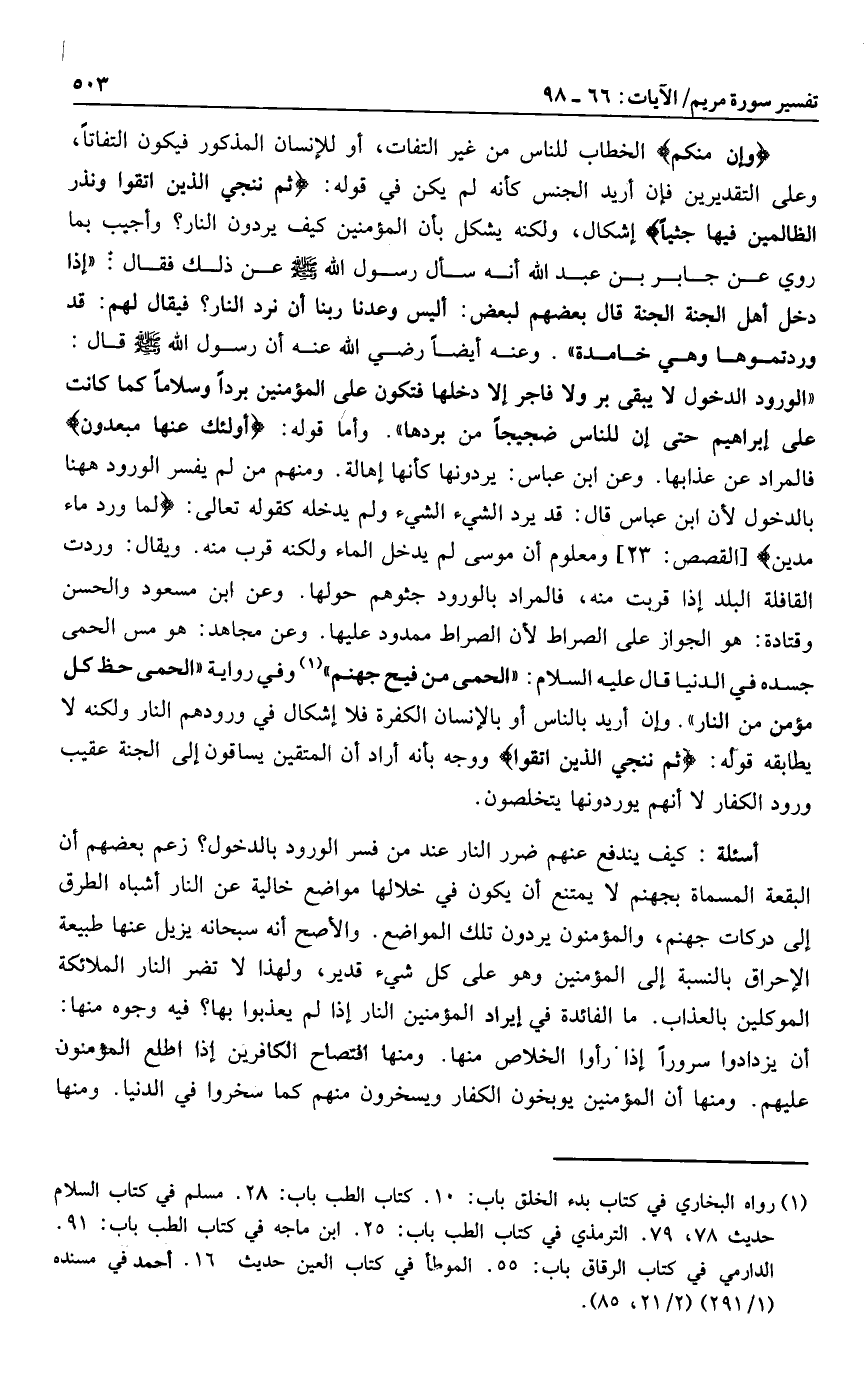 أسئلة: كيف يندفع عنهم ضرر النار عند من فسر الورود بالدخول؟ زعم بعضهم أن البقعة المسماة بجهنم لا يمتنع أن يكون في خلالها مواضع خالية عن النار أشباه الطرق إلى دركات جهنم، والمؤمنون يردون تلك المواضع. والأصح أنه سبحانه يزيل عنها طبيعة الإحراق بالنسبة إلى المؤمنين وهو على كل شيء قدير، ولهذا لا تضر النار الملائكة الموكلين بالعذاب. ما الفائدة في إيراد المؤمنين النار إذا لم يعذبوا بها؟ فيه وجوه منها: