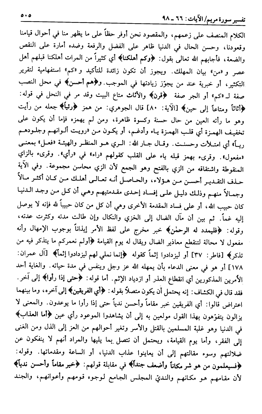 أَثاثاً وَمَتاعاً إِلى حِينٍ [الآية: 80] قال الجوهري: من همز رِءْياً جعله من رأيت وهو ما رأته العين من حال حسنة وكسوة ظاهرة، ومن لم يهمزه فإما أن يكون على تخفيف الهمزة أي قلب الهمزة ياء وأدغم، أو يكون من «رويت ألوانهم وجلودهم ريا» أي امتلأت وحسنت. وقال جار الله: الري هو المنظر والهيئة «فعل» بمعنى «مفعول» . وقرىء بهمز قبله ياء على القلب كقولهم «راء» في «رأي» . وقرىء بالزاي المنقوطة واشتقاقه من الزي بالفتح وهو الجمع لأن الزي محاسن مجموعة. وفي الآية حذف التقدير أحسن من هؤلاء، والحاصل أنه تعالى أهلك من كان أكثر مالا وجمالا منهم وذلك دليل على إفساد إحدى مقدمتيهم وهي أن كل من وجد الدنيا كان حبيب الله، أو على فساد المقدمة الأخرى وهي أن كل من كان حبيبا لله فإنه لا يوصل إليه غما. ثم بين أن مآل الضال إلى الخزي والنكال وإن طالت مدته وكثرت عدته، وقوله: فَلْيَمْدُدْ لَهُ الرَّحْمنُ خبر مخرج على لفظ الأمر إيذانا بوجوب الإمهال وأنه مفعول لا محالة لتنقطع معاذير الضال ويقال له يوم القيامة أَوَلَمْ نُعَمِّرْكُمْ ما يَتَذَكَّرُ فِيهِ مَنْ تَذَكَّرَ [فاطر: 37] أو ليزدادوا إثما كقوله إِنَّما نُمْلِي لَهُمْ لِيَزْدادُوا إِثْماً [آل عمران:
