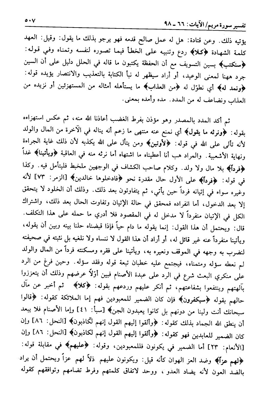 قال: ويحتمل أن هذا القول: إنما يقوله ما دام حيا فإذا قبضناه حلنا بينه وبين أن يقوله، ويأتينا منفردا عنه غير قائل له، أو أراد أن هذا القول لا ننساه ولا نلغيه بل نثبته في صحيفته لنضرب به وجهه في الموقف ونعيره به، ويأتينا على فقره ومسكنته فردا من المال والولد لم نعطه سؤله ومتمناه، فيجتمع عليه خطبان تبعة قوله وفقد سؤله. وحين فرغ من الرد على منكري البعث شرع في الرد على عبدة الأصنام فبين أوّلا عرضهم وذلك أن يتعززوا بآلهتهم وينتفعوا بشفاعتهم، ثم أنكر عليهم وردعهم بقوله: كَلَّا ثم أخبر عن مآل حالهم بقوله سَيَكْفُرُونَ فإن كان الضمير للمعبودين فهم إما الملائكة كقوله: قالُوا سُبْحانَكَ أَنْتَ وَلِيُّنا مِنْ دُونِهِمْ بَلْ كانُوا يَعْبُدُونَ الْجِنَّ [سبأ: 41] وإما الأصنام فلا يبعد أن ينطق الله الجماد بذلك كقوله: فَأَلْقَوْا إِلَيْهِمُ الْقَوْلَ إِنَّكُمْ لَكاذِبُونَ [النحل: 86] وإن كان الضمير للعابدين فهو كقوله: فَأَلْقَوْا إِلَيْهِمُ الْقَوْلَ إِنَّكُمْ لَكاذِبُونَ [النحل: 86] وإن [الأنعام: 23] أما الضمير في يكونون فللمعبودين، وقوله: عَلَيْهِمْ في مقابلة قوله: