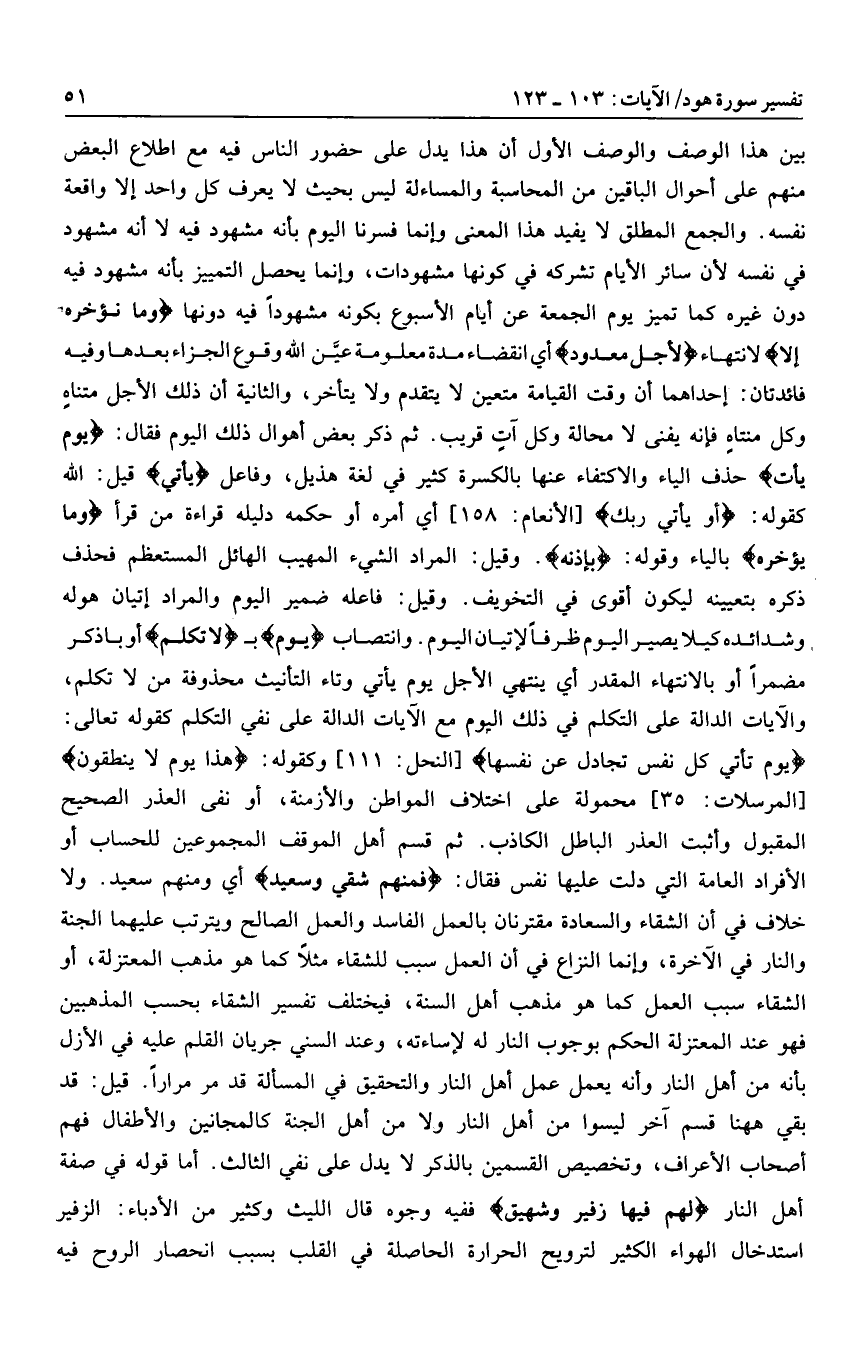 بين هذا الوصف والوصف الأول أن هذا يدل على حضور الناس فيه مع اطلاع البعض منهم على أحوال الباقين من المحاسبة والمساءلة ليس بحيث لا يعرف كل واحد إلا واقعة نفسه. والجمع المطلق لا يفيد هذا المعنى وإنما فسرنا اليوم بأنه مشهود فيه لا أنه مشهود في نفسه لأن سائر الأيام تشركه في كونها مشهودات، وإنما يحصل التمييز بأنه مشهود فيه دون غيره كما تميز يوم الجمعة عن أيام الأسبوع بكونه مشهودا فيه دونها وَما نُؤَخِّرُهُ إِلَّا لانتهاء لِأَجَلٍ مَعْدُودٍ أي انقضاء مدة معلومة عيّن الله وقوع الجزاء بعدها وفيه فائدتان: إحداهما أن وقت القيامة متعين لا يتقدم ولا يتأخر، والثانية أن ذلك الأجل متناه وكل منتاه فإنه يفنى لا محالة وكل آت قريب. ثم ذكر بعض أهوال ذلك اليوم فقال: يَوْمَ يَأْتِ حذف الياء والاكتفاء عنها بالكسرة كثير في لغة هذيل، وفاعل يأتي قيل: الله كقوله: أَوْ يَأْتِيَ رَبُّكَ [الأنعام: 158] أي أمره أو حكمه دليله قراءة من قرأ وما يؤخره بالياء وقوله: بِإِذْنِهِ. وقيل: المراد الشيء المهيب الهائل المستعظم فحذف ذكره بتعيينه ليكون أقوى في التخويف. وقيل: فاعله ضمير اليوم والمراد إتيان هو له وشدائده كيلا يصير اليوم ظرفا لإتيان اليوم. وانتصاب يَوْمَ ب لا تَكَلَّمُ أو باذكر مضمرا أو بالانتهاء المقدر أي ينتهي الأجل يوم يأتي وتاء التأنيث محذوفة من لا تكلم، والآيات الدالة على التكلم في ذلك اليوم مع الآيات الدالة على نفي التكلم كقوله تعالى: