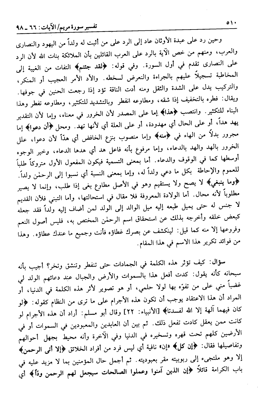 سؤال: كيف تؤثر هذه الكلمة في الجمادات حتى تنفطر وتنشق وتخر؟ أجيب بأنه سبحانه كأنه يقول: كدت أفعل هذا بالسماوات والأرض والجبال عند دعائهم الولد لي غضبا مني على من تفوّه بها لولا حلمي، أو هو تصوير لأثر هذه الكلمة في الدنيا، أو المراد أن هذا الاعتقاد يوجب أن تكون هذه الأجرام على ما ترى من النظام كقوله: لَوْ كانَ فِيهِما آلِهَةٌ إِلَّا اللَّهُ لَفَسَدَتا [الأنبياء: 22] وقال أبو مسلم: أراد أن هذه الأجرام لو كانت ممن يعقل كادت تفعل ذلك. ثم بين أن العابدين والمعبودين في السموات أو في الأرضين كلهم تحت قهره وتسخيره في الدنيا وفي الآخرة وأنه محيط بجهل أحوالهم وتفاصيلها فقال: إِنْ كُلُّ «إن» نافية أي ليس فرد من أفراد الخلائق إلا أتى الرحمن إلا وهو ملتجىء إلى ربوبيته مقر بعبوديته. ثم أجمل حال المؤمنين بما لا مزيد عليه في باب الكرامة قائلا إِنَّ الَّذِينَ آمَنُوا وَعَمِلُوا الصَّالِحاتِ سَيَجْعَلُ لَهُمُ الرَّحْمنُ وُدًّا أي