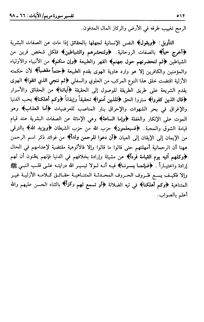 وَيَقُولُ النفس الإنسانية لجهلها بالحقائق إذا مات عن الصفات البشرية أُخْرَجُ حَيًّا بالصفات الروحانية. لَنَحْشُرَنَّهُمْ وَالشَّياطِينَ فلكل شخص قرين من الشياطين ثُمَّ لَنُحْضِرَنَّهُمْ حَوْلَ جَهَنَّمَ القهر والطبيعة إِنْ مِنْكُمْ من الأنبياء والأولياء والمؤمنين والكافرين إلا هو وارد هاوية الهوى بقدم الطبيعة حَتْماً مَقْضِيًّا لأن حكمته الأزلية اقتضت خلق هذا النوع المركب من العلوي والسفلي ثُمَّ نُنَجِّي الَّذِينَ اتَّقَوْا الهوى يقدم الشريعة على طريق الطريقة للوصول إلى الحقيقة آياتُنا من الحقائق والأسرار قالَ الَّذِينَ كَفَرُوا ستروا الحق لِلَّذِينَ آمَنُوا تحقيقا وإيقانا وَكَمْ أَهْلَكْنا بحب الدنيا والإغراق في بحر الشهوات والإحراق بنار المناصب للعرضيات إِمَّا الْعَذابَ وهو الموت على الإنكار والغفلة وَإِمَّا السَّاعَةَ وهي الإماتة عن الصفات البشرية عند قيام قيامة الشوق والمحبة. فَسَيَعْلَمُونَ حزب الله من حزب الشيطان وَيَزِيدُ اللَّهُ بالترقي من الإيمان إلى الإيقان إلى العيان أَنْ دَعَوْا لِلرَّحْمنِ وَلَداً من فوائد ذكر اسم الرحمن هاهنا أن الرحمانية أمهلتهم حتى قالوا ما قالوا وإلا فالألوهية مقتضية لإعدامهم في الحال وَكُلُّهُمْ آتِيهِ يَوْمَ الْقِيامَةِ فَرْداً عن مشيئة وإرادة بخلافهم في الدنيا فإنهم يظنون أن لهم إرادة واختيارا. فَإِنَّما يَسَّرْناهُ فيه أنه لولا تيسير الله درايته على قلب النبي صلى الله عليه وسلم وإلا فكيف يسع ظروف الحروف المحدثة المتناهية حقائق كلامه الأزلية غير المتناهية وَكَمْ أَهْلَكْنا في تيه الضلالة أَوْ تَسْمَعُ لَهُمْ رِكْزاً بالثناء الحسن عليهم والله أعلم بالصواب.