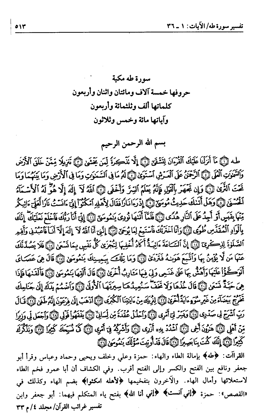 طه بإمالة الطاء والهاء: حمزة وعلي وخلف ويحيى وحماد وعباس وقرأ أبو جعفر ونافع بين الفتح والكسر وإلى الفتح أقرب. وفي الكشاف أن أبا عمرو فخم الطاء لاستعلائها وأمال الهاء. والآخرون بتفخيمها لِأَهْلِهِ امْكُثُوا بضم الهاء وكذلك في «القصص» : حمزة إِنِّي آنَسْتُ إِنِّي أَنَا اللَّهُ بفتح ياء المتكلم فيهما: أبو جعفر وابن