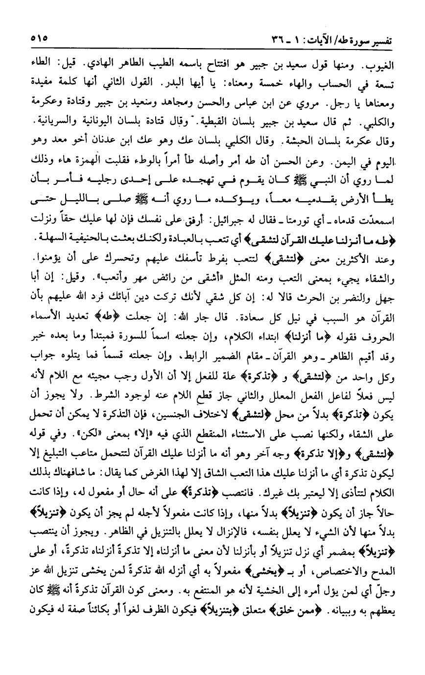 الغيوب. ومنها قول سعيد بن جبير هو افتتاح باسمه الطيب الطاهر الهادي. قيل: الطاء تسعة في الحساب والهاء خمسة ومعناه: يا أيها البدر. القول الثاني أنها كلمة مفيدة ومعناها يا رجل. مروي عن ابن عباس والحسن ومجاهد وسعيد بن جبير وقتادة وعكرمة والكلبي. ثم قال سعيد بن جبير بلسان القبطية. وقال قتادة بلسان اليونانية والسريانية.