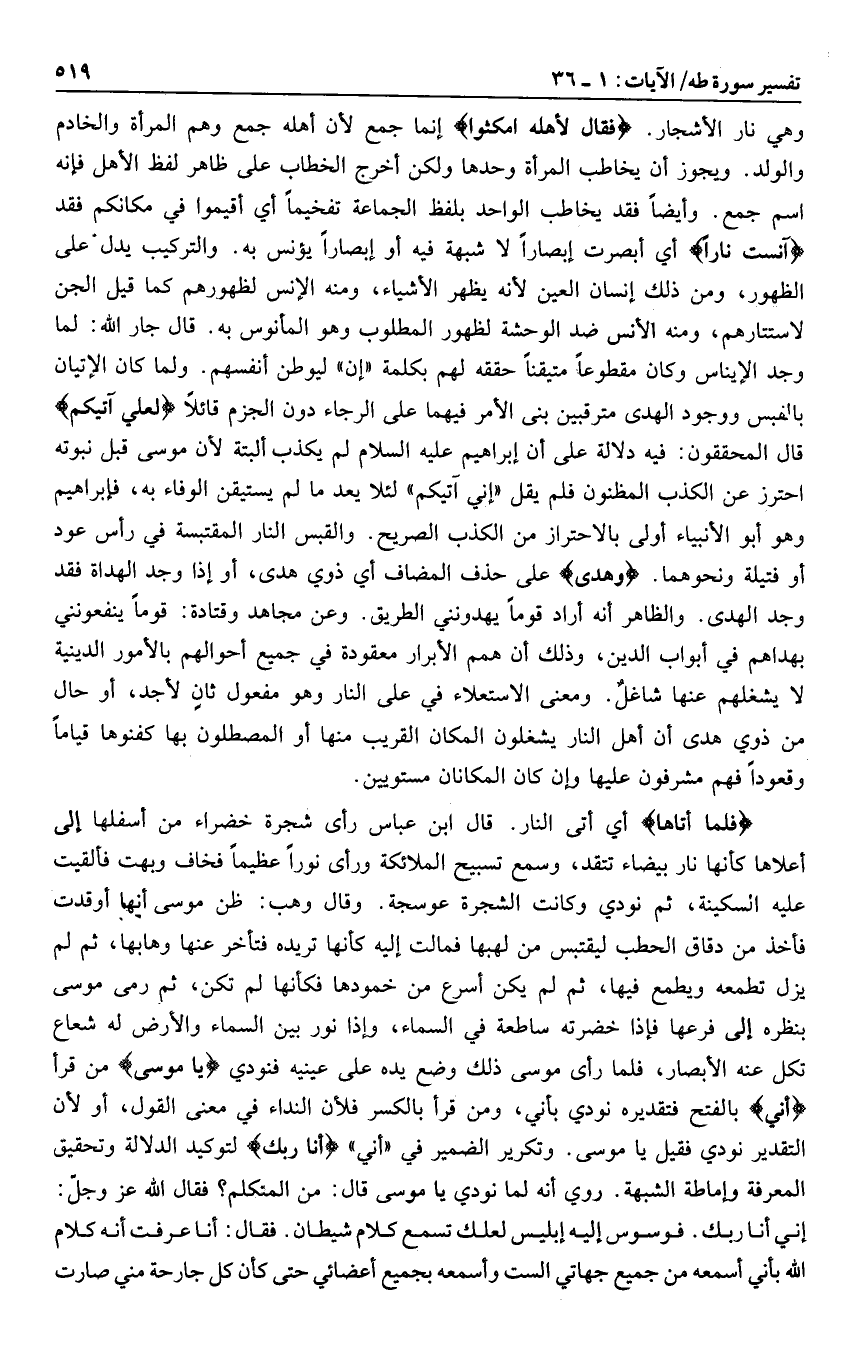 وهي نار الأشجار. فَقالَ لِأَهْلِهِ امْكُثُوا إنما جمع لأن أهله جمع وهم المرأة والخادم والولد. ويجوز أن يخاطب المرأة وحدها ولكن أخرج الخطاب على ظاهر لفظ الأهل فإنه اسم جمع. وأيضا فقد يخاطب الواحد بلفظ الجماعة تفخيما أي أقيموا في مكانكم فقد آنَسْتُ ناراً أي أبصرت إبصارا لا شبهة فيه أو إبصارا يؤنس به. والتركيب يدل على الظهور، ومن ذلك إنسان العين لأنه يظهر الأشياء، ومنه الإنس لظهورهم كما قيل الجن لاستتارهم، ومنه الأنس ضد الوحشة لظهور المطلوب وهو المأنوس به. قال جار الله: لما وجد الإيناس وكان مقطوعا متيقنا حققه لهم بكلمة «إن» ليوطن أنفسهم. ولما كان الإتيان بالقبس ووجود الهدى مترقبين بنى الأمر فيهما على الرجاء دون الجزم قائلا لَعَلِّي آتِيكُمْ قال المحققون: فيه دلالة على أن إبراهيم عليه السلام لم يكذب البتة لأن موسى قبل نبوته احترز عن الكذب المظنون فلم يقل «إني آتيكم» لئلا يعد ما لم يستيقن الوفاء به، فإبراهيم وهو أبو الأنبياء أولى بالاحتراز من الكذب الصريح. والقبس النار المقتبسة في رأس عود أو فتيلة ونحوهما. وهُدىً على حذف المضاف أي ذوي هدى، أو إذا وجد الهداة فقد وجد الهدى. والظاهر أنه أراد قوما يهدونني الطريق. وعن مجاهد وقتادة: قوما ينفعونني بهداهم في أبواب الدين، وذلك أن همم الأبرار معقودة في جميع أحوالهم بالأمور الدينية لا يشغلهم عنها شاغل. ومعنى الاستعلاء في على النار وهو مفعول ثان لأجد، أو حال من ذوي هدى أن أهل النار يشغلون المكان القريب منها أو المصطلون بها كفنوها قياما وقعودا فهم مشرفون عليها وإن كان المكانان مستويين.