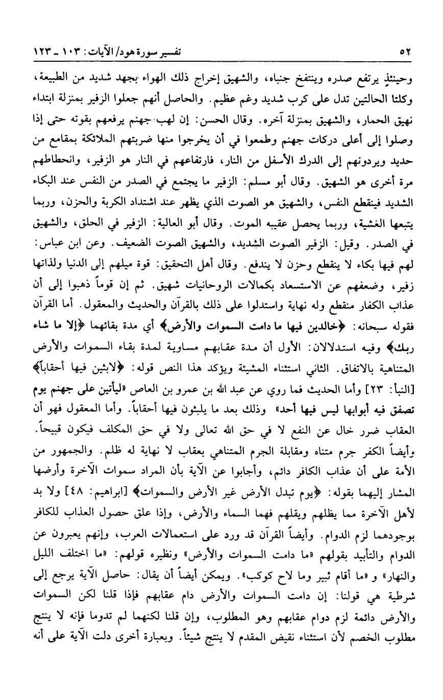 وأيضا الكفر جرم متناه ومقابلة الجرم المتناهي بعقاب لا نهاية له ظلم. والجمهور من الأمة على أن عذاب الكافر دائم، وأجابوا عن الآية بأن المراد سموات الآخرة وأرضها المشار إليهما بقوله: يَوْمَ تُبَدَّلُ الْأَرْضُ غَيْرَ الْأَرْضِ وَالسَّماواتُ [ابراهيم: 48] ولا بد لأهل الآخرة مما يظلهم ويقلهم فهما السماء والأرض، وإذا علق حصول العذاب للكافر بوجودهما لزم الدوام. وأيضا القرآن قد ورد على استعمالات العرب، وإنهم يعبرون عن الدوام والتأبيد بقولهم «ما دامت السموات والأرض» ونظيره قولهم: «ما اختلف الليل والنهار» و «ما أقام ثبير وما لاح كوكب» . ويمكن أيضا أن يقال: حاصل الآية يرجع إلى شرطية هي قولنا: إن دامت السموات والأرض دام عقابهم فإذا قلنا لكن السموات والأرض دائمة لزم دوام عقابهم وهو المطلوب، وإن قلنا لكنهما لم تدوما فإنه لا ينتج مطلوب الخصم لأن استثناء نقيض المقدم لا ينتج شيئا. وبعبارة أخرى دلت الآية على أنه