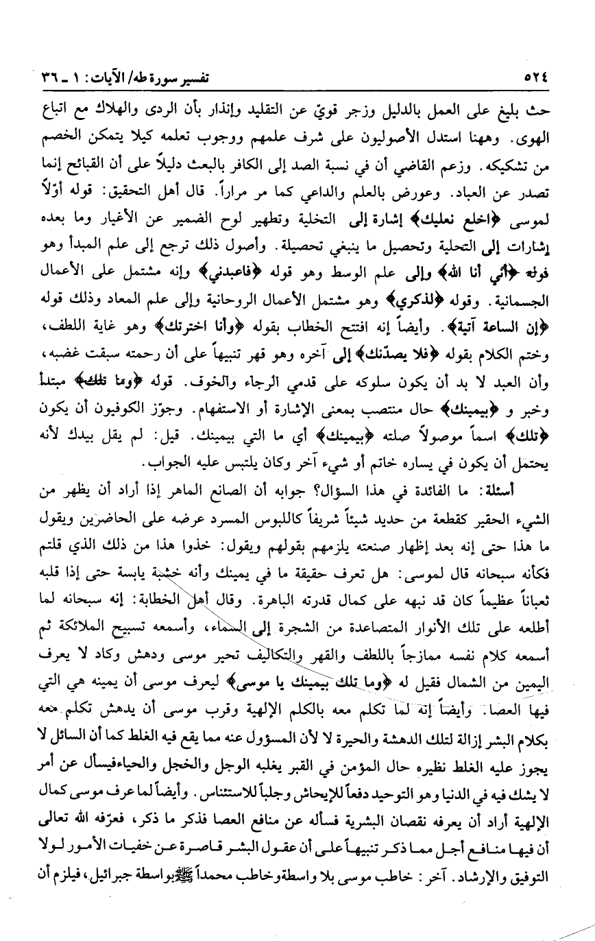 أسئلة: ما الفائدة في هذا السؤال؟ جوابه أن الصانع الماهر إذا أراد أن يظهر من الشيء الحقير كقطعة من حديد شيئا شريفا كاللبوس المسرد عرضه على الحاضرين ويقول ما هذا حتى إنه بعد إظهار صنعته يلزمهم بقولهم ويقول: خذوا هذا من ذلك الذي قلتم فكأنه سبحانه قال لموسى: هل تعرف حقيقة ما في يمينك وأنه خشبة يابسة حتى إذا قلبه ثعبانا عظيما كان قد نبهه على كمال قدرته الباهرة. وقال أهل الخطابة: إنه سبحانه لما أطلعه على تلك الأنوار المتصاعدة من الشجرة إلى السماء، وأسمعه تسبيح الملائكة ثم أسمعه كلام نفسه ممازجا باللطف والقهر والتكاليف تحير موسى ودهش وكاد لا يعرف اليمين من الشمال فقيل له وَما تِلْكَ بِيَمِينِكَ يا مُوسى ليعرف موسى أن يمينه هي التي فيها العصا. وأيضا إنه لما تكلم معه بالكلم الإلهية وقرب موسى أن يدهش تكلم معه بكلام البشر إزالة لتلك الدهشة والحيرة لا لأن المسئول عنه مما يقع فيه الغلط كما أن السائل لا يجوز عليه الغلط نظيره حال المؤمن في القبر يغلبه الوجل والخجل والحياء فيسأل عن أمر لا يشك فيه في الدنيا وهو التوحيد دفعا للإيحاش وجلبا للاستئناس. وأيضا لما عرف موسى كمال الإلهية أراد أن يعرفه نقصان البشرية فسأله عن منافع العصا فذكر ما ذكر، فعرّفه الله تعالى أن فيها منافع أجل مما ذكر تنبيها على أن عقول البشر قاصرة عن خفيات الأمور لولا التوفيق والإرشاد. آخر: خاطب موسى بلا واسطة وخاطب محمدا صلى الله عليه وسلم بواسطة جبرائيل، فيلزم أن
