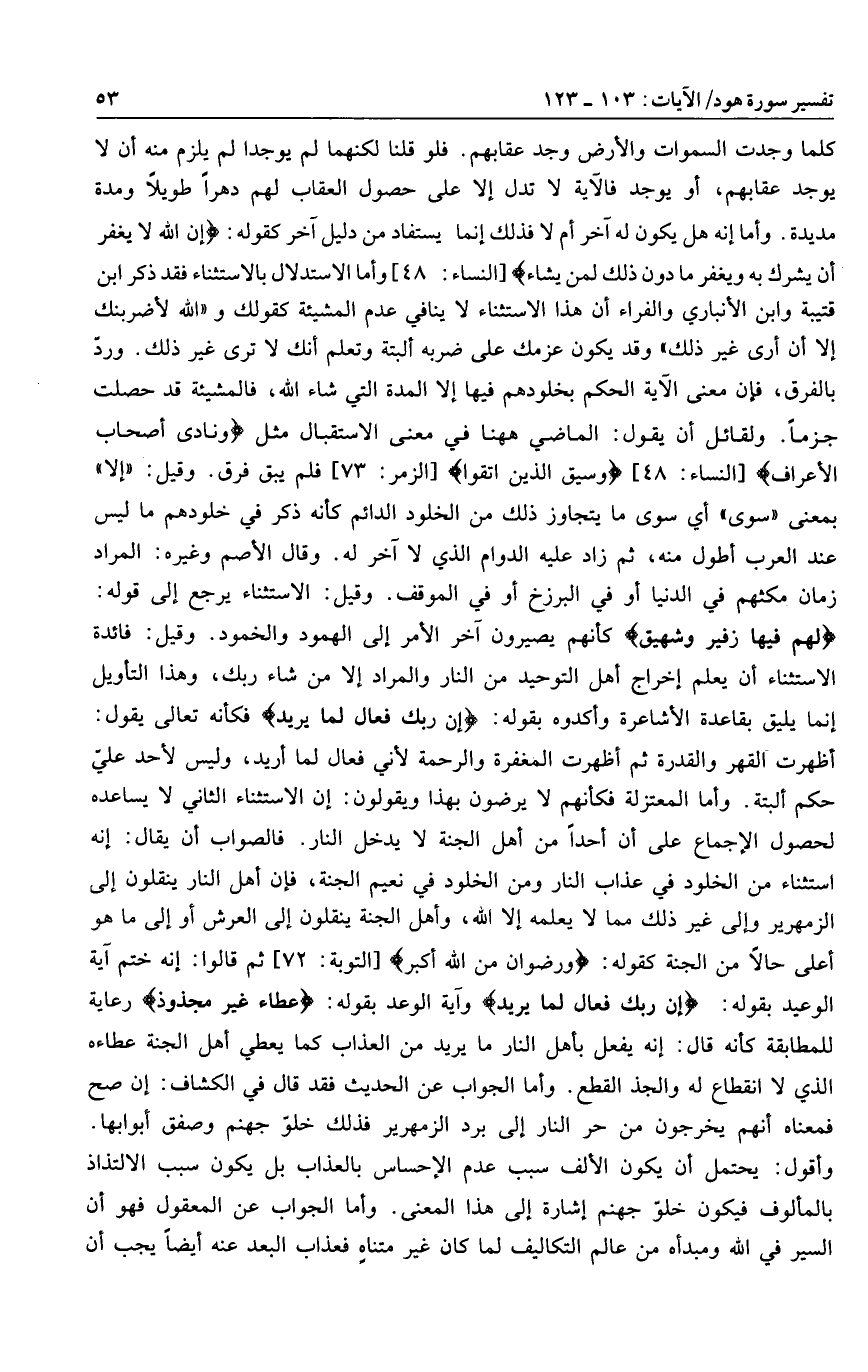 لَهُمْ فِيها زَفِيرٌ وَشَهِيقٌ كأنهم يصيرون آخر الأمر إلى الهمود والخمود. وقيل: فائدة الاستثناء أن يعلم إخراج أهل التوحيد من النار والمراد إلا من شاء ربك، وهذا التأويل إنما يليق بقاعدة الأشاعرة وأكدوه بقوله: إِنَّ رَبَّكَ فَعَّالٌ لِما يُرِيدُ فكأنه تعالى يقول: