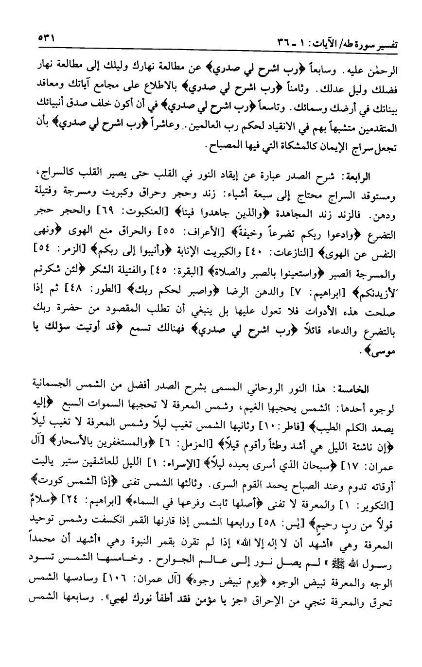 الخامسة: هذا النور الروحاني المسمى بشرح الصدر أفضل من الشمس الجسمانية لوجوه أحدها: الشمس يحجبها الغيم، وشمس المعرفة لا تحجبها السموات السبع إِلَيْهِ يَصْعَدُ الْكَلِمُ الطَّيِّبُ [فاطر: 10] وثانيها الشمس تغيب ليلا وشمس المعرفة لا تغيب ليلا إِنَّ ناشِئَةَ اللَّيْلِ هِيَ أَشَدُّ وَطْئاً وَأَقْوَمُ قِيلًا [المزمل: 6] وَالْمُسْتَغْفِرِينَ بِالْأَسْحارِ [آل عمران: 17] سُبْحانَ الَّذِي أَسْرى بِعَبْدِهِ لَيْلًا [الإسراء: 1] الليل للعاشقين ستير يا ليت أوقاته تدوم وعند الصباح يحمد القوم السرى. وثالثها الشمس تفنى إِذَا الشَّمْسُ كُوِّرَتْ [التكوير: 1] والمعرفة لا تفنى أَصْلُها ثابِتٌ وَفَرْعُها فِي السَّماءِ [ابراهيم: 24] سَلامٌ قَوْلًا مِنْ رَبٍّ رَحِيمٍ [يس: 58] ورابعها الشمس إذا قارنها القمر انكسفت وشمس توحيد المعرفة وهي «أشهد أن لا إله إلا الله» إذا لم تقرن بقمر النبوة وهي «أشهد أن محمدا رسول الله صلى الله عليه وسلم» لم يصل نور إلى عالم الجوارح. وخامسها الشمس تسود الوجه والمعرفة تبيض الوجوه يَوْمَ تَبْيَضُّ وُجُوهٌ [آل عمران: 106] وسادسها الشمس تحرق والمعرفة تنجي من الإحراق