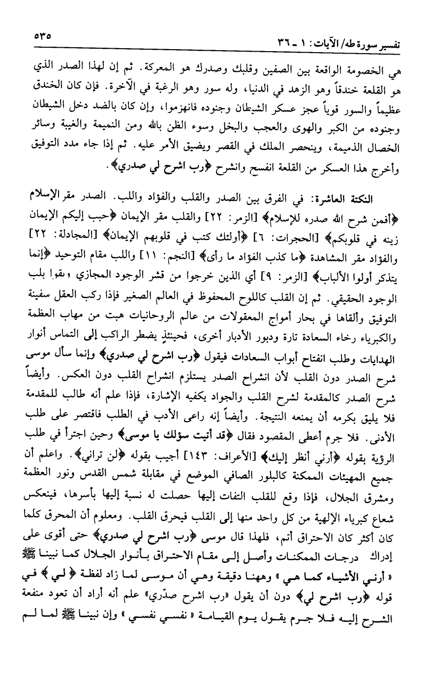 النكتة العاشرة: في الفرق بين الصدر والقلب والفؤاد واللب. الصدر مقر الإسلام أَفَمَنْ شَرَحَ اللَّهُ صَدْرَهُ لِلْإِسْلامِ [الزمر: 22] والقلب مقر الإيمان حَبَّبَ إِلَيْكُمُ الْإِيمانَ وَزَيَّنَهُ فِي قُلُوبِكُمْ [الحجرات: 6] أُولئِكَ كَتَبَ فِي قُلُوبِهِمُ الْإِيمانَ [المجادلة: 22] والفؤاد مقر المشاهدة ما كَذَبَ الْفُؤادُ ما رَأى [النجم: 11] واللب مقام التوحيد إِنَّما يَتَذَكَّرُ أُولُوا الْأَلْبابِ [الزمر: 9] أي الذين خرجوا من قشر الوجود المجازي ويقوا بلب الوجود الحقيقي. ثم إن القلب كاللوح المحفوظ في العالم الصغير فإذا ركب العقل سفينة التوفيق وألقاها في بحار أمواج المعقولات من عالم الروحانيات هبت من مهاب العظمة والكبرياء رخاء السعادة تارة ودبور الأدبار أخرى، فحينئذ يضطر الراكب إلى التماس أنوار الهدايات وطلب انفتاح أبواب السعادات فيقول رَبِّ اشْرَحْ لِي صَدْرِي وإنما سأل موسى شرح الصدر دون القلب لأن انشراح الصدر يستلزم انشراح القلب دون العكس. وأيضا شرح الصدر كالمقدمة لشرح القلب والجواد يكفيه الإشارة، فإذا علم أنه طالب للمقدمة فلا يليق بكرمه أن يمنعه النتيجة. وأيضا إنه راعى الأدب في الطلب فاقتصر على طلب الأدنى. فلا جرم أعطى المقصود فقال قَدْ أُوتِيتَ سُؤْلَكَ يا مُوسى وحين اجترأ في طلب الرؤية بقوله أَرِنِي أَنْظُرْ إِلَيْكَ [الأعراف: 143] أجيب بقوله لَنْ تَرانِي. واعلم أن جميع المهيئات الممكنة كالبلور الصافي الموضع في مقابلة شمس القدس ونور العظمة ومشرق الجلال، فإذا وقع للقلب التفات إليها حصلت له نسبة إليها بأسرها، فينعكس شعاع كبرياء الإلهية من كل واحد منها إلى القلب فيحرق القلب. ومعلوم أن المحرق كلما كان أكثر كان الاحتراق أتم، فلهذا قال موسى رَبِّ اشْرَحْ لِي صَدْرِي حتى أقوى على إدراك درجات الممكنات وأصل إلى مقام الاحتراق بأنوار الجلال كما نبينا صلى الله عليه وسلم