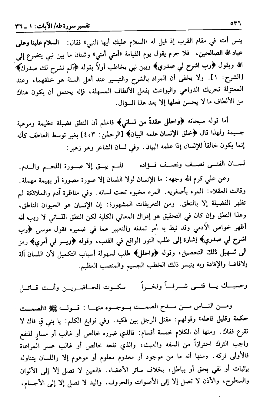 وقالت العقلاء: المرء بأصغريه. المرء مخبوء تحت لسانه. وفي مناظرة آدم والملائكة لم تظهر الفضيلة إلا بالنطق. ومن التعريفات المشهورة: إن الإنسان هو الحيوان الناطق، وهذا النطق وإن كان في التحقيق هو إدراك المعاني الكلية لكن النطق اللساني لا ريب أنه أظهر خواص الآدمي وقد نيط به أمر تمدنه والتعبير عما في ضميره فقول موسى رَبِّ اشْرَحْ لِي صَدْرِي إشارة إلى طلب النور الواقع في القلب، وقوله وَيَسِّرْ لِي أَمْرِي رمز الى تسهيل ذلك التحصيل، وقوله وَاحْلُلْ طلب لسهولة أسباب التكميل لأن اللسان آلة إلا فاضة والإفادة وبه يتيسر ذلك الخطب الجسيم والمنصب العظيم.