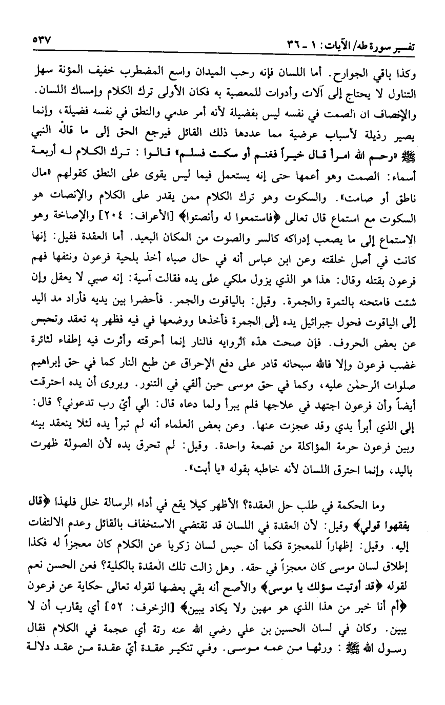 وما الحكمة في طلب حل العقدة؟ الأظهر كيلا يقع في أداء الرسالة خلل فلهذا قال يَفْقَهُوا قَوْلِي وقيل: لأن العقدة في اللسان قد تقتضي الاستخفاف بالقائل وعدم الالتفات إليه. وقيل: إظهارا للمعجزة فكما أن حبس لسان زكريا عن الكلام كان معجزا له فكذا إطلاق لسان موسى كان معجزا في حقه. وهل زالت تلك العقدة بالكلية؟ فعن الحسن نعم لقوله قَدْ أُوتِيتَ سُؤْلَكَ يا مُوسى والأصح أنه بقي بعضها لقوله تعالى حكاية عن فرعون أَمْ أَنَا خَيْرٌ مِنْ هذَا الَّذِي هُوَ مَهِينٌ وَلا يَكادُ يُبِينُ [الزخرف: 52] أي يقارب أن لا يبين.