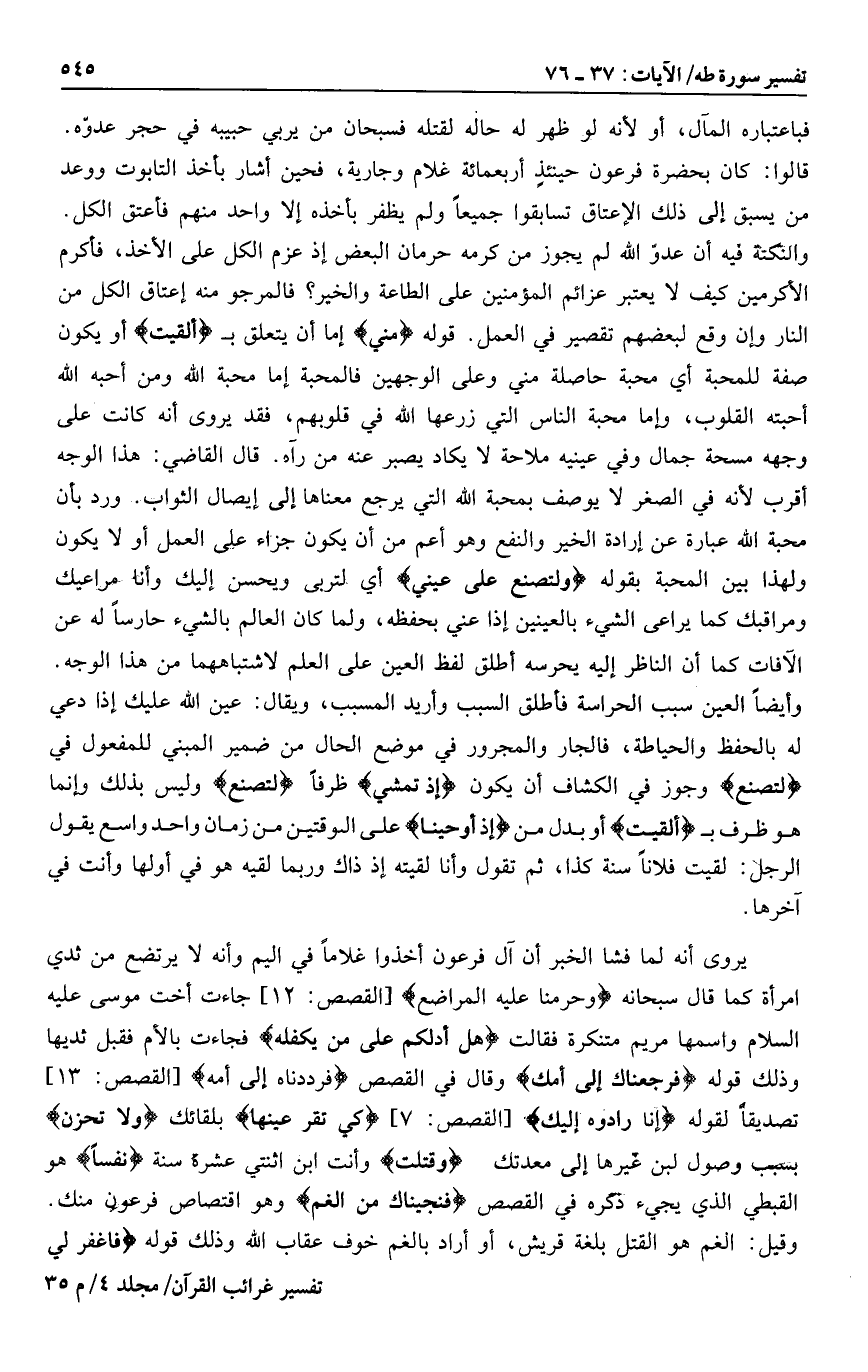 والنكتة فيه أن عدوّ الله لم يجوز من كرمه حرمان البعض إذ عزم الكل على الأخذ، فأكرم الأكرمين كيف لا يعتبر عزائم المؤمنين على الطاعة والخير؟ فالمرجو منه إعتاق الكل من النار وإن وقع لبعضهم تقصير في العمل. قوله مِنِّي إما أن يتعلق ب أَلْقَيْتُ أو يكون صفة للمحبة أي محبة حاصلة مني وعلى الوجهين فالمحبة إما محبة الله ومن أحبه الله أحبته القلوب، وإما محبة الناس التي زرعها الله في قلوبهم، فقد يروى أنه كانت على وجهه مسحة جمال وفي عينيه ملاحة لا يكاد يصبر عنه من رآه. قال القاضي: هذا الوجه أقرب لأنه في الصغر لا يوصف بمحبة الله التي يرجع معناها إلى إيصال الثواب. ورد بأن محبة الله عبارة عن إرادة الخير والنفع وهو أعم من أن يكون جزاء على العمل أو لا يكون ولهذا بين المحبة بقوله وَلِتُصْنَعَ عَلى عَيْنِي أي لتربى ويحسن إليك وأنا مراعيك ومراقبك كما يراعى الشيء بالعينين إذا عني بحفظه، ولما كان العالم بالشيء حارسا له عن الآفات كما أن الناظر إليه يحرسه أطلق لفظ العين على العلم لاشتباههما من هذا الوجه.