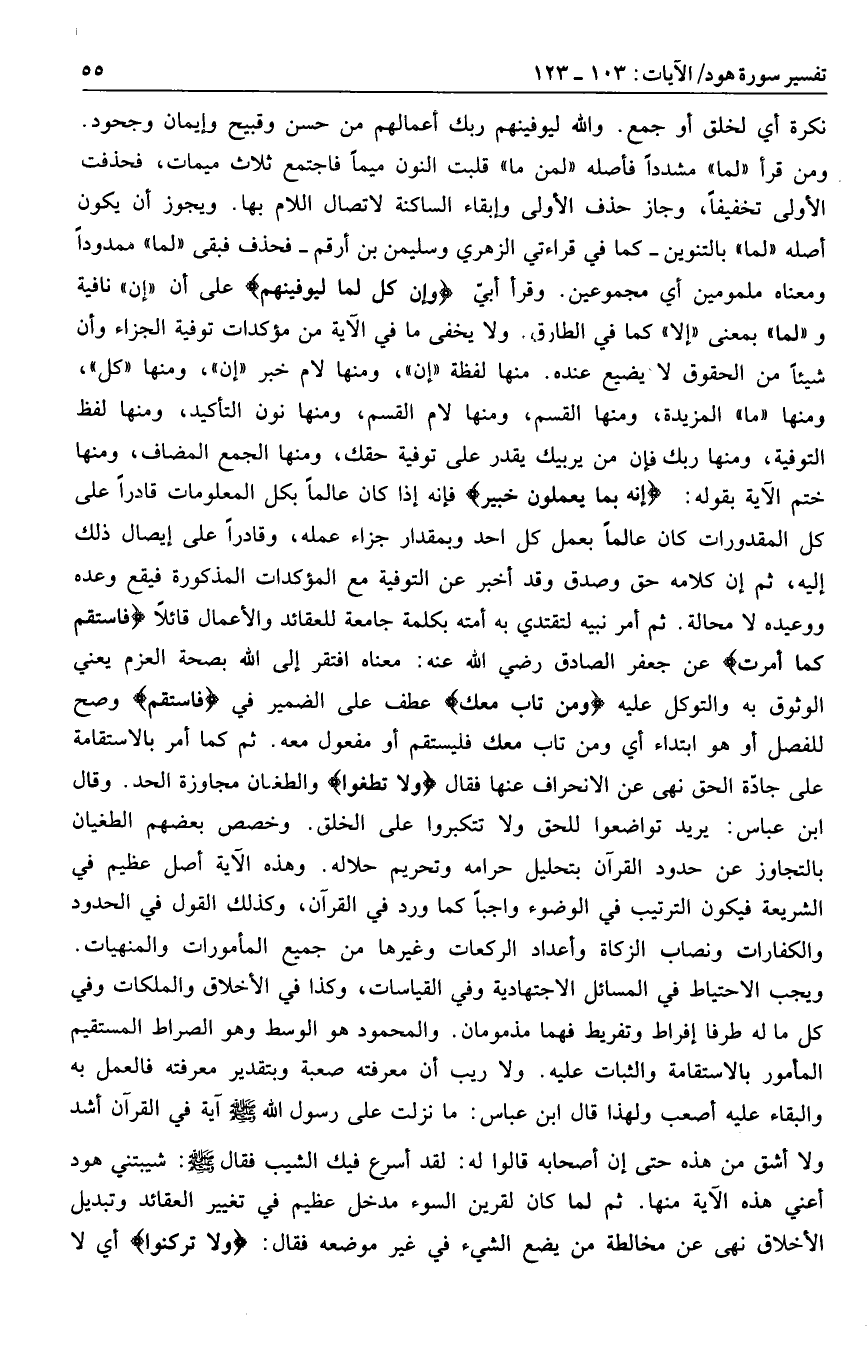ومن قرأ «لما» مشددا فأصله «لمن ما» قلبت النون ميما فاجتمع ثلاث ميمات، فحذفت الأولى تخفيفا، وجاز حذف الأولى وإبقاء الساكنة لاتصال اللام بها. ويجوز أن يكون أصله «لما» بالتنوين- كما في قراءتي الزهري وسليمن بن أرقم- فحذف فبقى «لما» ممدودا ومعناه ملمومين أي مجموعين. وقرأ أبيّ وإن كل لما ليوفينهم على أن «إن» نافية و «لما» بمعنى «إلا» كما في الطارق. ولا يخفى ما في الآية من مؤكدات توفية الجزاء وأن شيئا من الحقوق لا يضيع عنده. منها لفظة «إن» ، ومنها لام خبر «إن» ، ومنها «كل» ، ومنها «ما» المزيدة، ومنها القسم، ومنها لام القسم، ومنها نون التأكيد، ومنها لفظ التوفية، ومنها ربك فإن من يربيك يقدر على توفية حقك، ومنها الجمع المضاف، ومنها ختم الآية بقوله: إِنَّهُ بِما يَعْمَلُونَ خَبِيرٌ فإنه إذا كان عالما بكل المعلومات قادرا على كل المقدورات كان عالما بعمل كل أحد وبمقدار جزاء عمله، وقادرا على إيصال ذلك إليه، ثم إن كلامه حق وصدق وقد أخبر عن التوفية مع المؤكدات المذكورة فيقع وعده ووعيده لا محالة. ثم أمر نبيه لتقتدي به أمته بكلمة جامعة للعقائد والأعمال قائلا فَاسْتَقِمْ كَما أُمِرْتَ عن جعفر الصادق رضي الله عنه: معناه افتقر إلى الله بصحة العزم يعني الوثوق به والتوكل عليه وَمَنْ تابَ مَعَكَ عطف على الضمير في فَاسْتَقِمْ وصح للفصل أو هو ابتداء أي ومن تاب معك فليستقم أو مفعول معه. ثم كما أمر بالاستقامة على جادّة الحق نهى عن الانحراف عنها فقال وَلا تَطْغَوْا والطغيان مجاوزة الحد. وقال ابن عباس: يريد تواضعوا للحق ولا تتكبروا على الخلق. وخصص بعضهم الطغيان بالتجاوز عن حدود القرآن بتحليل حرامه وتحريم حلاله. وهذه الآية أصل عظيم في الشريعة فيكون الترتيب في الوضوء واجبا كما ورد في القرآن، وكذلك القول في الحدود والكفارات ونصاب الزكاة وأعداد الركعات وغيرها من جميع المأمورات والمنهيات.