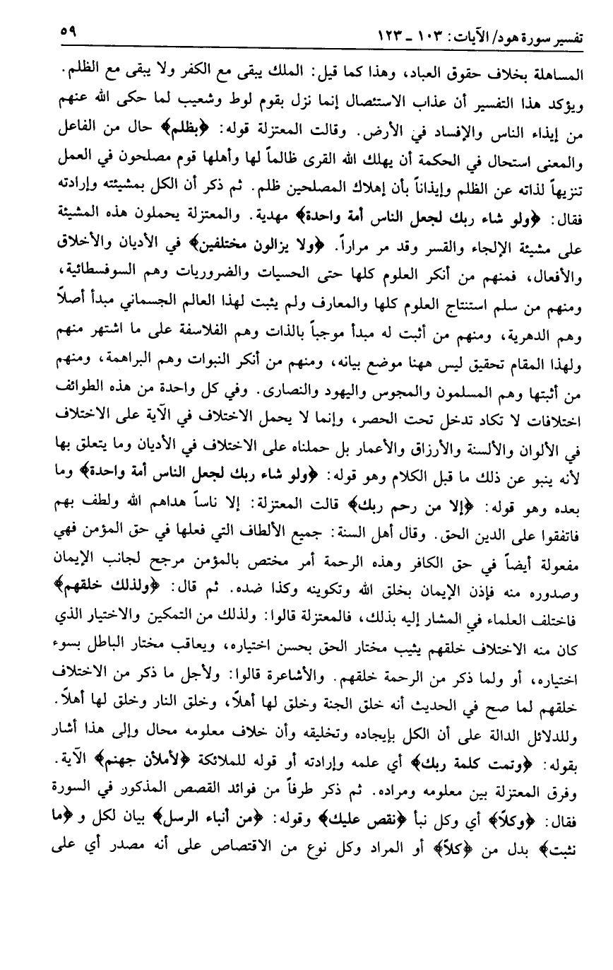ويؤكد هذا التفسير أن عذاب الاستئصال إنما نزل بقوم لوط وشعيب لما حكى الله عنهم من إيذاء الناس والإفساد في الأرض. وقالت المعتزلة قوله: بِظُلْمٍ حال من الفاعل والمعنى استحال في الحكمة أن يهلك الله القرى ظالما لها وأهلها قوم مصلحون في العمل تنزيها لذاته عن الظلم وإيذانا بأن إهلاك المصلحين ظلم. ثم ذكر أن الكل بمشيئته وإرادته فقال: وَلَوْ شاءَ رَبُّكَ لَجَعَلَ النَّاسَ أُمَّةً واحِدَةً مهدية. والمعتزلة يحملون هذه المشيئة على مشيئة الإلجاء والقسر وقد مر مرارا. وَلا يَزالُونَ مُخْتَلِفِينَ في الأديان والأخلاق والأفعال، فمنهم من أنكر العلوم كلها حتى الحسيات والضروريات وهم السوفسطائية، ومنهم من سلم استنتاج العلوم كلها والمعارف ولم يثبت لهذا العالم الجسماني مبدأ أصلا وهم الدهرية، ومنهم من أثبت له مبدأ موجبا بالذات وهم الفلاسفة على ما اشتهر منهم ولهذا المقام تحقيق ليس هاهنا موضع بيانه، ومنهم من أنكر النبوات وهم البراهمة، ومنهم من أثبتها وهم المسلمون والمجوس واليهود والنصارى. وفي كل واحدة من هذه الطوائف اختلافات لا تكاد تدخل تحت الحصر، وإنما لا يحمل الاختلاف في الآية على الاختلاف في الألوان والألسنة والأرزاق والأعمار بل حملناه على الاختلاف في الأديان وما يتعلق بها لأنه ينبو عن ذلك ما قبل الكلام وهو قوله: وَلَوْ شاءَ رَبُّكَ لَجَعَلَ النَّاسَ أُمَّةً واحِدَةً وما بعده وهو قوله: إِلَّا مَنْ رَحِمَ رَبُّكَ قالت المعتزلة: إلا ناسا هداهم الله ولطف بهم فاتفقوا على الدين الحق. وقال أهل السنة: جميع الألطاف التي فعلها في حق المؤمن فهي مفعولة أيضا في حق الكافر وهذه الرحمة أمر مختص بالمؤمن مرجع لجانب الإيمان وصدوره منه فإذن الإيمان بخلق الله وتكوينه وكذا ضده. ثم قال: وَلِذلِكَ خَلَقَهُمْ فاختلف العلماء في المشار إليه بذلك، فالمعتزلة قالوا: ولذلك من التمكين والاختيار الذي كان منه الاختلاف خلقهم يثيب مختار الحق بحسن اختياره، ويعاقب مختار الباطل بسوء اختياره، أو ولما ذكر من الرحمة خلقهم. والأشاعرة قالوا: ولأجل ما ذكر من الاختلاف خلقهم لما صح