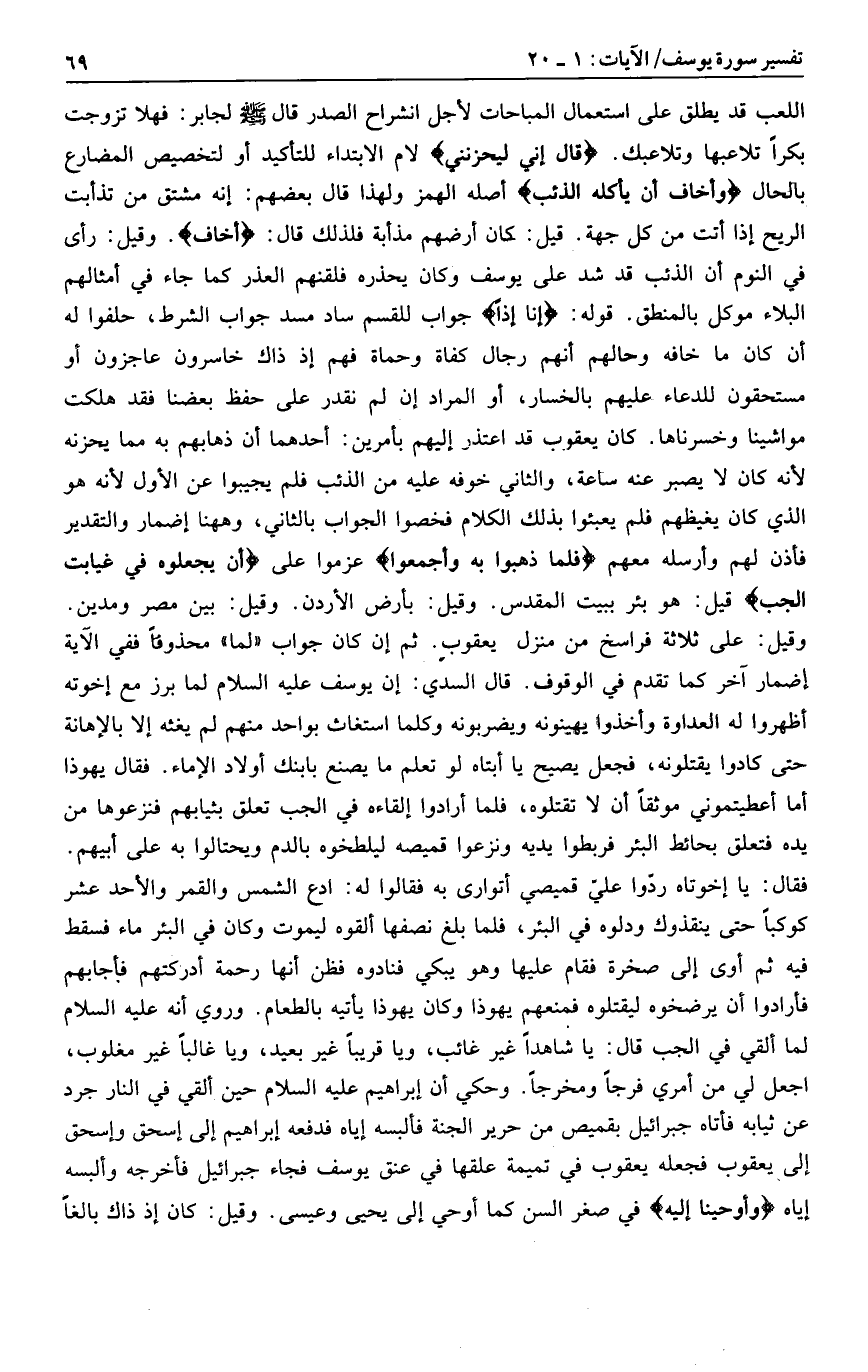 قالَ إِنِّي لَيَحْزُنُنِي لام الابتداء للتأكيد أو لتخصيص المضارع بالحال وَأَخافُ أَنْ يَأْكُلَهُ الذِّئْبُ أصله الهمز ولهذا قال بعضهم: إنه مشتق من تذأبت الريح إذا أتت من كل جهة. قيل: كان أرضهم مذأبة فلذلك قال: أَخافُ. وقيل: رأى في النوم أن الذئب قد شد على يوسف وكان يحذره فلقنهم العذر كما جاء في أمثالهم البلاء موكل بالمنطق. قوله: إِنَّا إِذاً جواب للقسم ساد مسد جواب الشرط، حلفوا له أن كان ما خافه وحالهم أنهم رجال كفاة وحماة فهم إذ ذاك خاسرون عاجزون أو مستحقون للدعاء عليهم بالخسار، أو المراد إن لم نقدر على حفظ بعضنا فقد هلكت مواشينا وخسرناها. كان يعقوب قد اعتذر إليهم بأمرين: أحدهما أن ذهابهم به مما يحزنه لأنه كان لا يصبر عنه ساعة، والثاني خوفه عليه من الذئب فلم يجيبوا عن الأول لأنه هو الذي كان يغيظهم فلم يعبئوا بذلك الكلام فخصوا الجواب بالثاني، وهاهنا إضمار والتقدير فأذن لهم وأرسله معهم فَلَمَّا ذَهَبُوا بِهِ وَأَجْمَعُوا عزموا على أَنْ يَجْعَلُوهُ فِي غَيابَتِ الْجُبِّ قيل: هو بئر ببيت المقدس. وقيل: بأرض الأردن. وقيل: بين مصر ومدين.